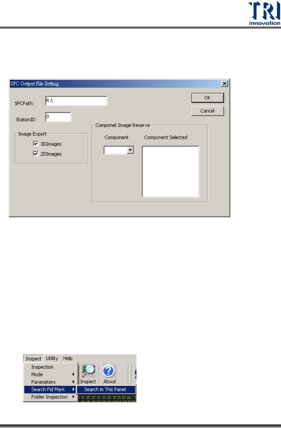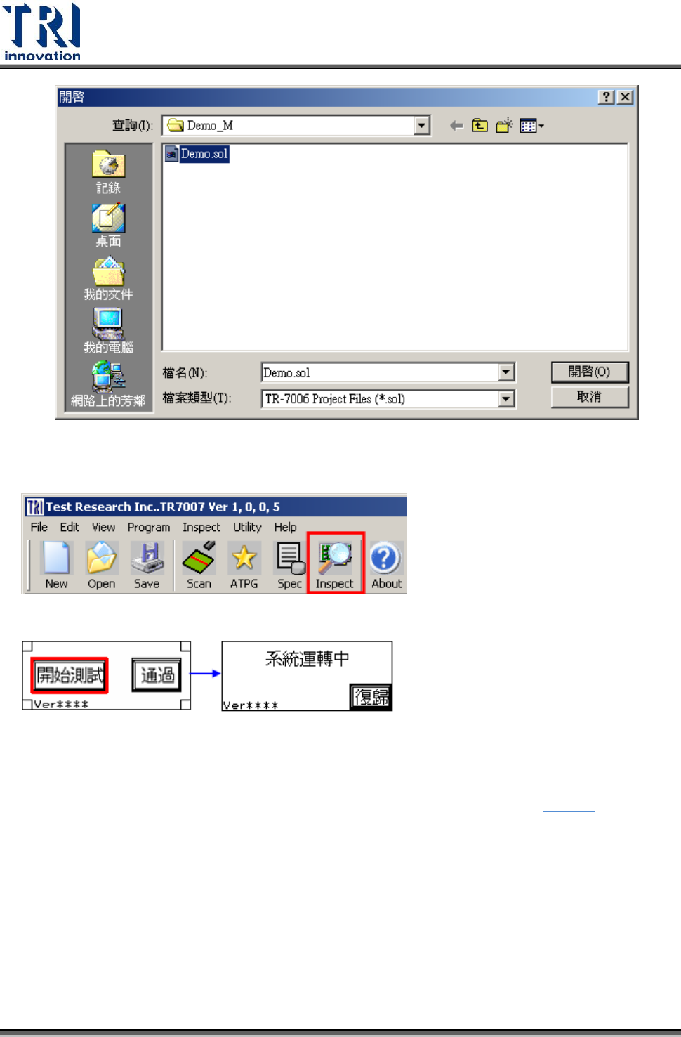Test Research Inc. 262 TR 7007 SII User Guid e – Softwar e 7) 按下 [Inspect] 開始檢測 8. 結束測試 1) 按下人機鍵面上之 [ 復歸 ] 鈕以停止繼續進板。 2) 按下鍵盤上之 Esc 案鈕來停止檢測中的程式。 3) 按下 案鈕來關閉 TR 7007 主程式。 4) 按下 TR 7007 主電腦之 [ 開始 / 關機 ] 將電腦關閉。 5) 若有 Motion …