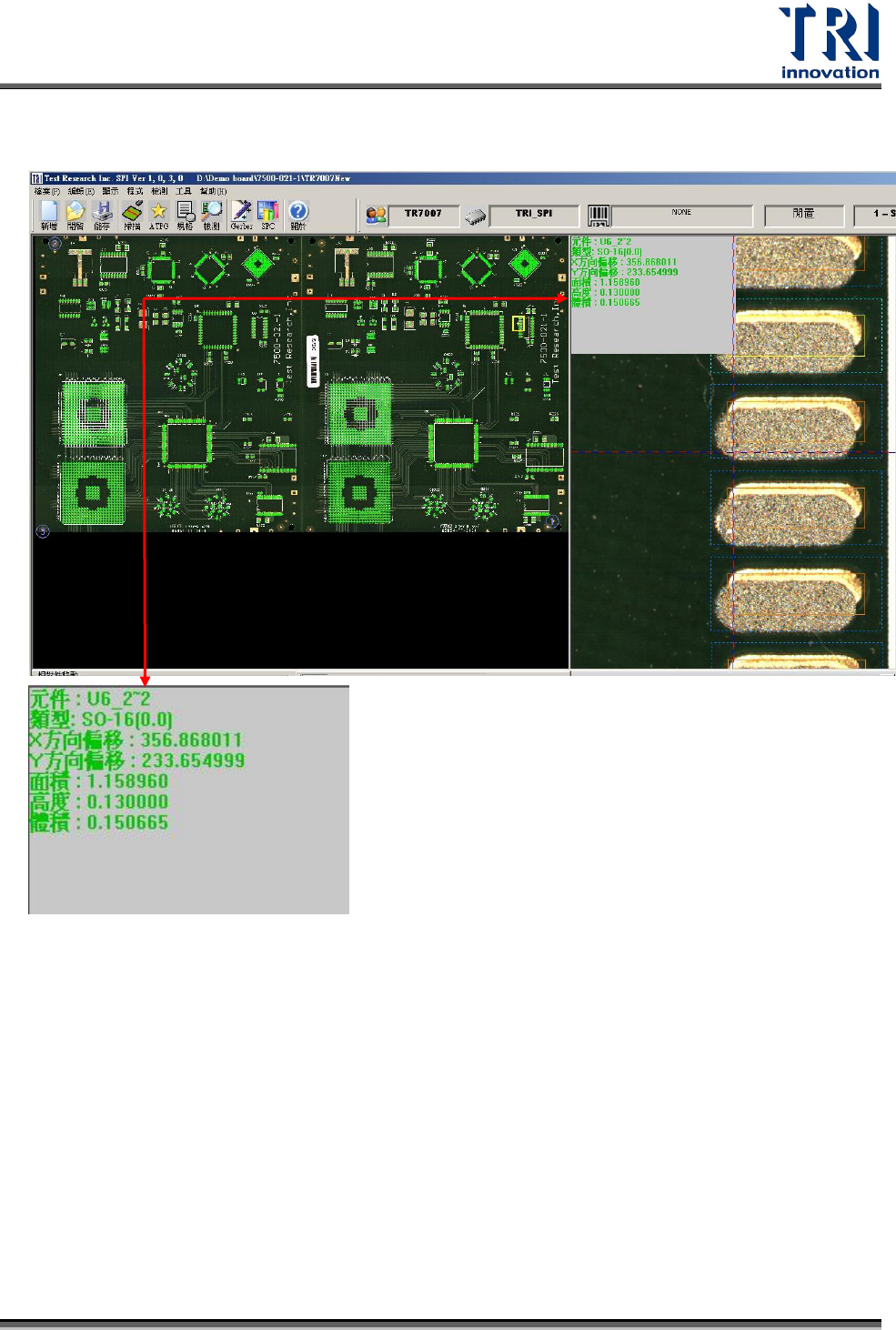 Test Research Inc. 28 TR 7007 SII User Guid e – Softwar e 2.9 主程式參數設 定 2.9.1 搜尋對位標記 1) 選擇 [ 檢測 / 搜尋對位標記 / 在面板中搜尋 ] 2) 定位點找到後所有的檢測框會出現。