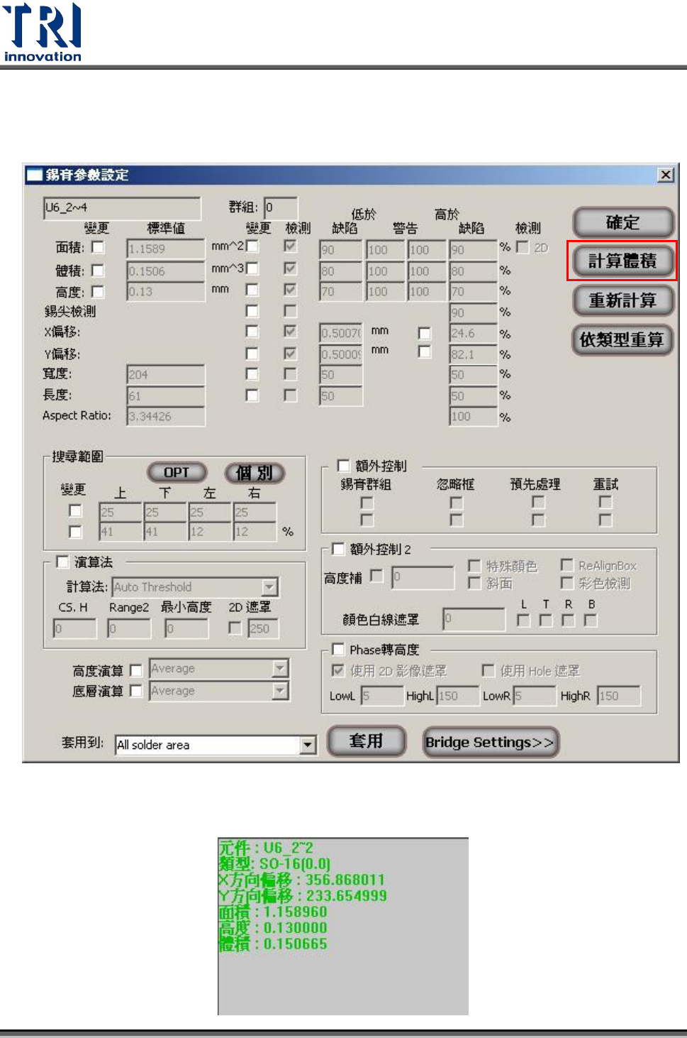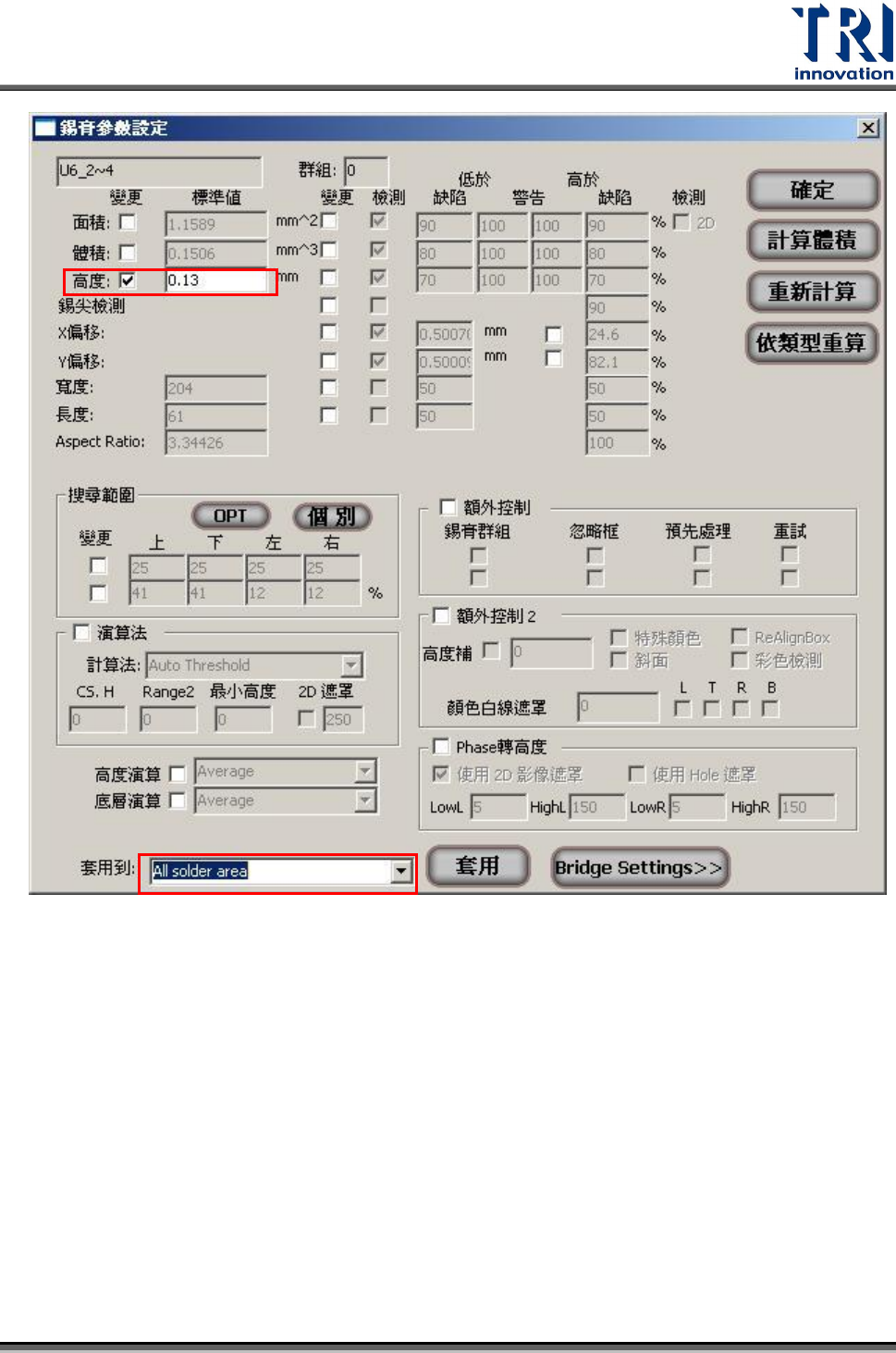 solder area]後,按下[套用]按鈕,系統即將勾選的高度值設為檢測框參數。