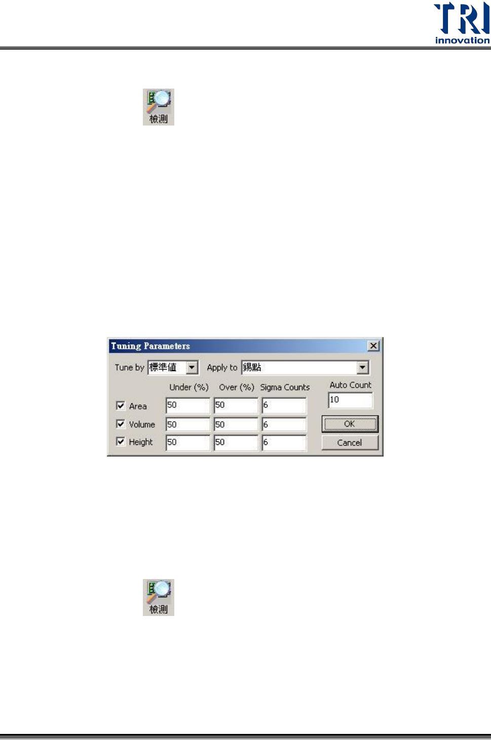 自動調整模式–選擇此模式後,會出現下列設定視窗,機台會自動調整參數,設定檢測