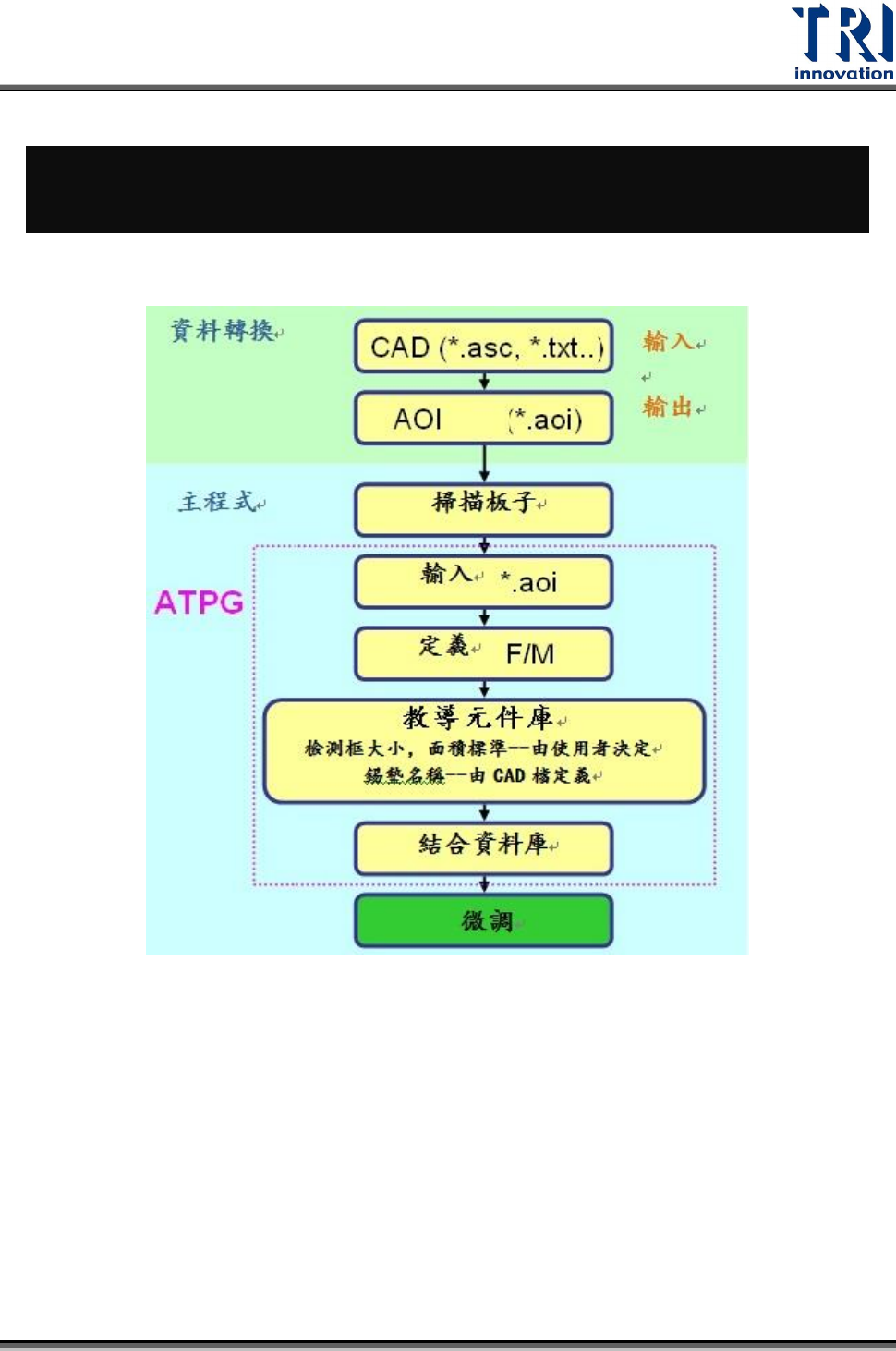 Test Research Inc. TR 7007 SII Us er Guide – Sof tware 43 3 其他程式製作方式 3.1 使用 A OI 檔 (F/M : Fiducial Mark 對位標記 ) Step1. 設定待測板大小 Step2. 擷取機板大圖 Step3. 啟動 ATPG( 自動檢測程式產生器 ) 流程 Step4. 載入 AO I 檔案 在建立新程式時須將 CAD 檔案轉檔成為 T R7007SII…