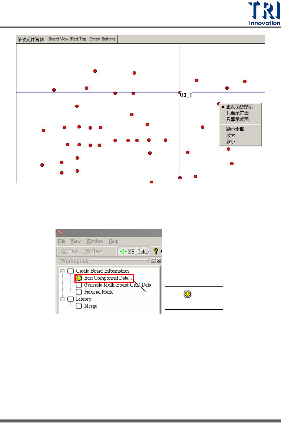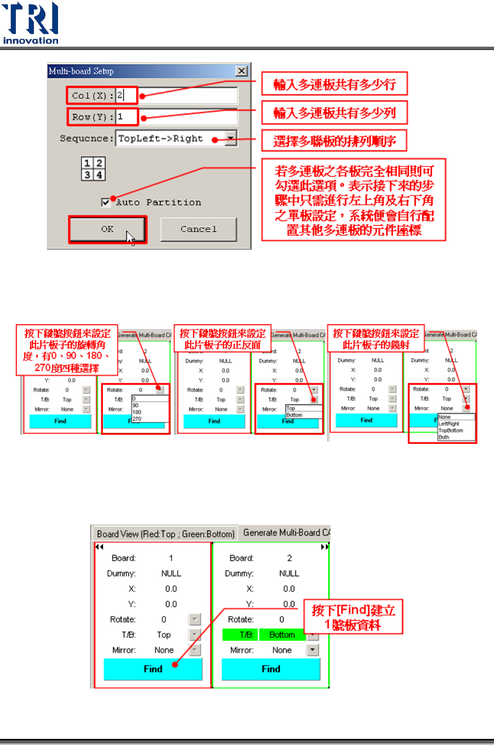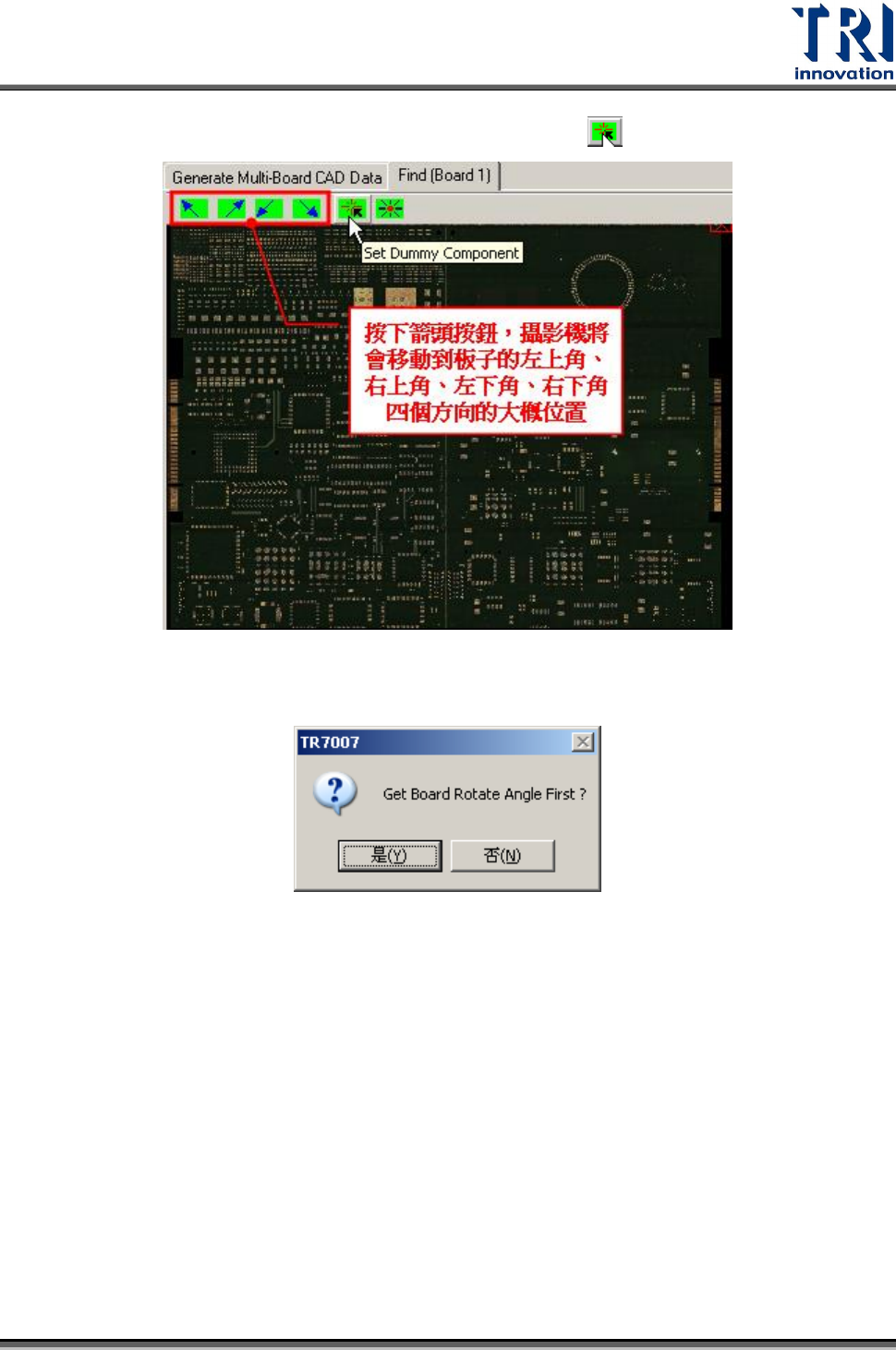 Test Research Inc. 52 TR 7007 SII User Guid e – Softwar e Step7. 在 [ 編輯元件資料 ] 中需將元件資料設定成與 1 號板之資料相同,故在此只需設 定 1 號板之外其他板子的角度與正反面。 Step8. 建立 1 號板資料 1. 按下 1 號板子的 [ Find ] 鈕