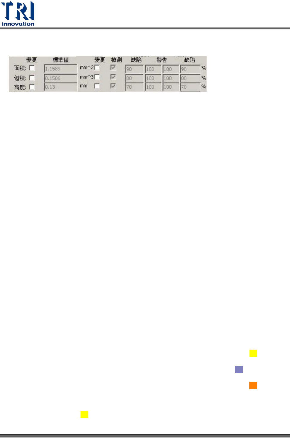 [面積]–設定檢測錫膏面積參數。[變更]欄位選取時,才可以修改其後方欄位的資