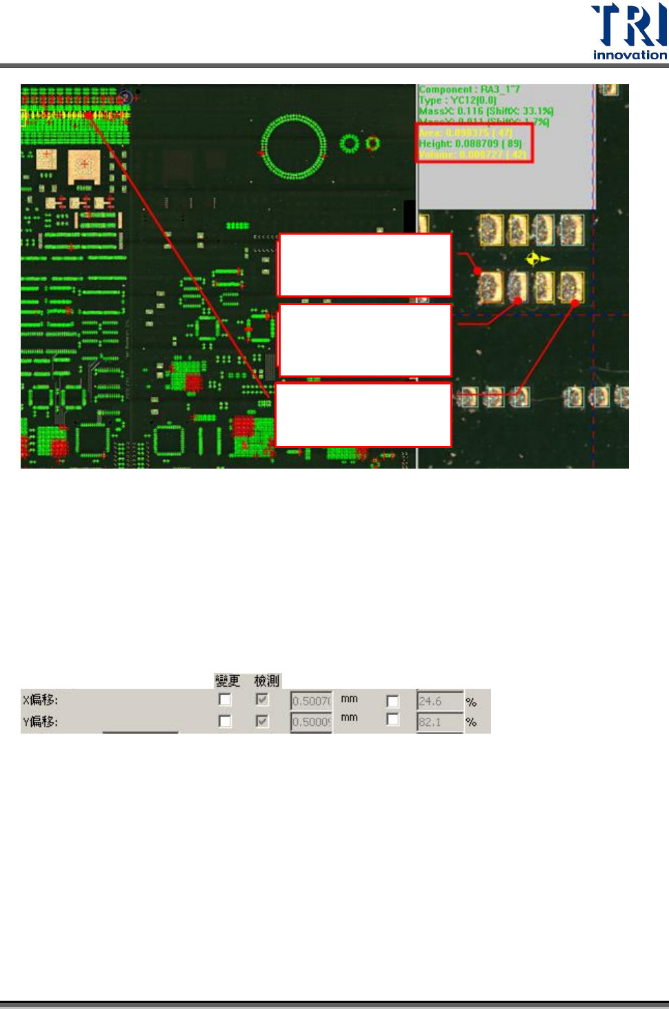 Test Research Inc. TR 7007 SII Us er Guide – Sof tware 87 3) [ 錫尖檢測 ] –檢測錫點拉錫尖的情況,後方參數表示檢測之錫尖高度,大於標準高 度的百分之多少時,將視為缺點。 4) [ 錫膏偏移參數設定 ] [ X 偏移 ] –檢測錫膏 X 方 向的偏移。先勾 [ 變更 ] 方塊才可設定後方參數。後方空格需輸入 容許程度,可選擇輸入絕對容許值或是佔檢測框的百分比 ( 兩者在設定…