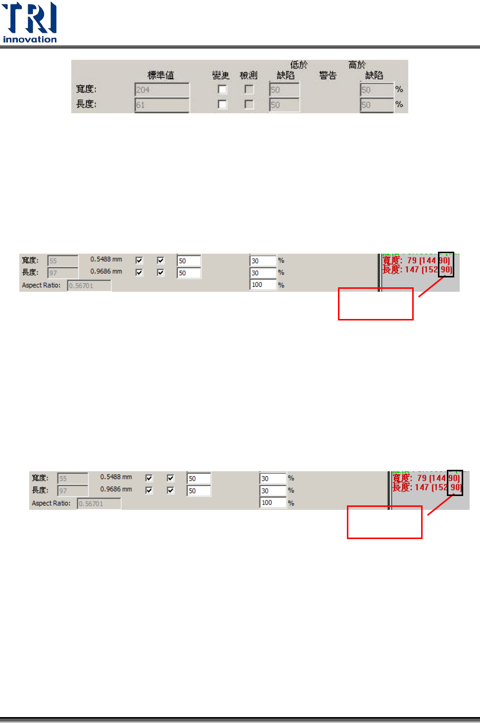 (注意需搭配 Aspect Ratio 使用,當寬度檢測值超出容許範圍且錫形分數低於