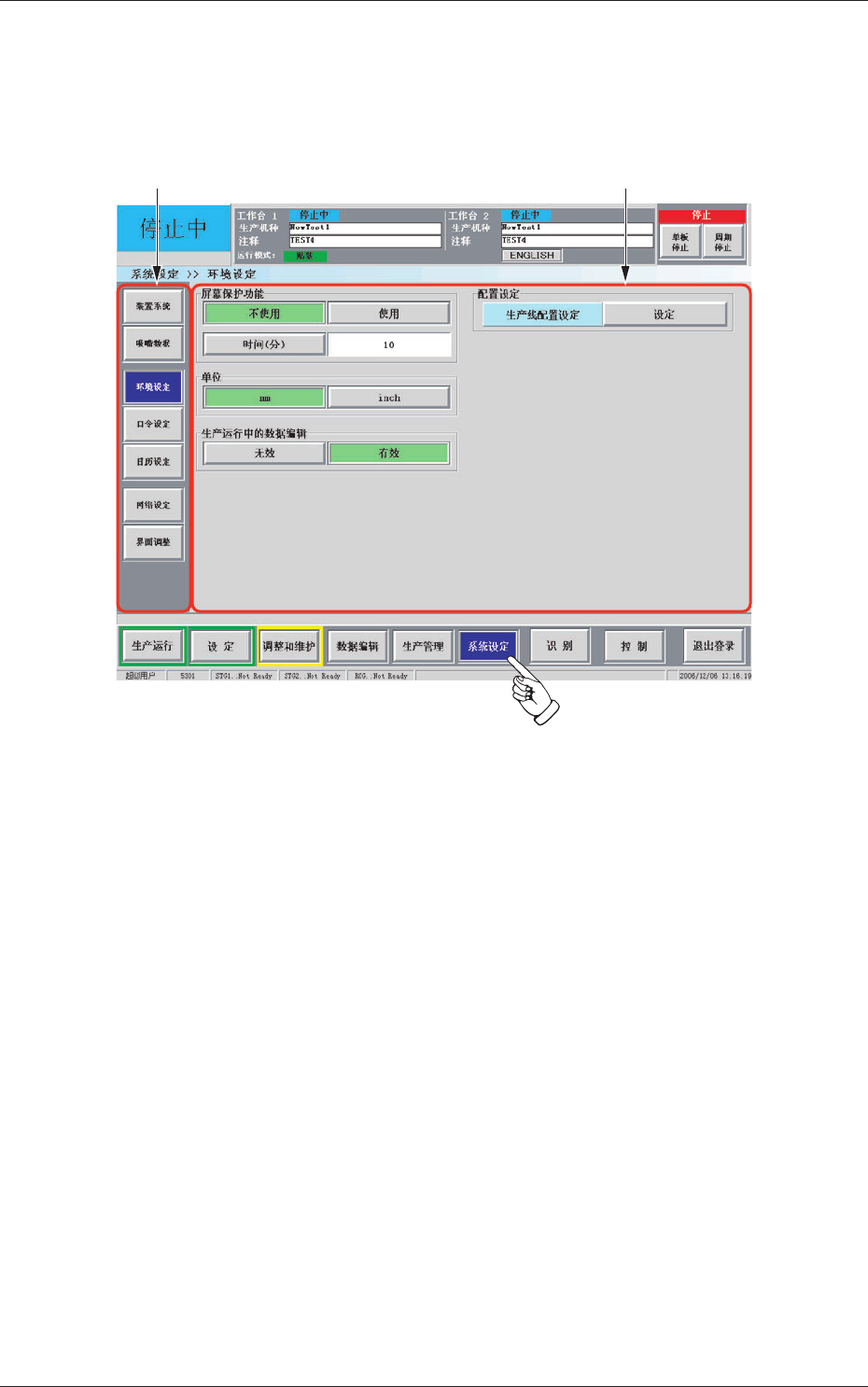 环境设定 进行屏幕保护功能的设定、单位的切换、生产运行中的数据编辑有効