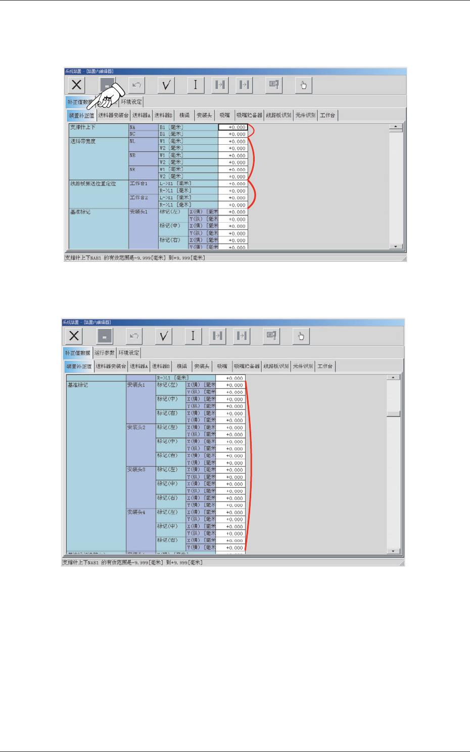 6 - 5 0603 - 001 补正值数据分为以下选项卡,按 Tab,显示各选项卡。 Table 3F2 Tab 内 容 装置补正值 调整从线路板定位 XY 坐标看到的对 XY 横梁驱动 XY 坐标的设定尺寸 的位置偏离以及角度偏离。 送料器安装台 分别调整各送料器安装台设计值的偏离量。 送料器 A 用装置固有的补正值数据调整从线路板定位 XY 坐标看到的各送料器 编号的送料器对吸取位置及高度的设计尺寸的位置偏离。 送料器 B 补正设…