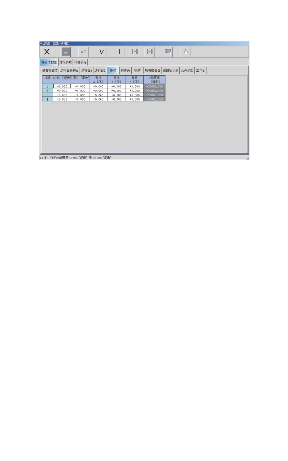 6 - 17 0603 - 001 2.1 补正值数据 [1] X( 横 )、Y( 纵 )[毫米] 调整从装置基准坐标系原点和安装头原点位置到线路板识别照相 机中心的设计尺寸的位置偏离的数据。 [2] 角度 X、角度 Y[度] 将横梁 X 及 Y 轴对准装置基准坐标系的数据。 Xm(+) Ym(+) Yb(+) Xb(+) Yb(+) Xb(+) Fig. 3F13 Note 以装置基准坐标系为基准实际横梁坐标系往逆时针方向倾斜时,横梁…