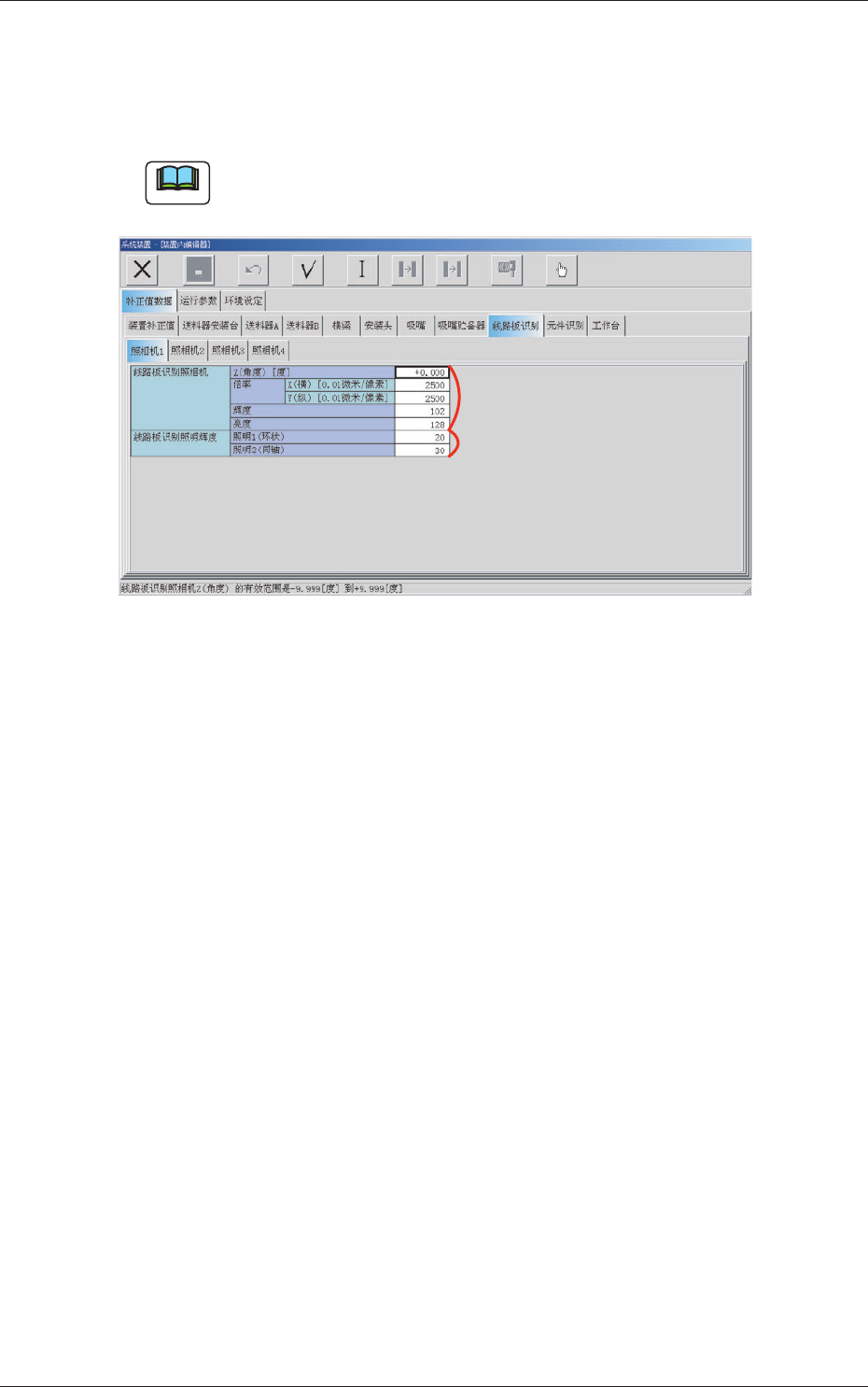 在“补正值数据”选项卡中,按 [ 线路板识别 ]Tab,再按 [ 照相机 1]Tab,