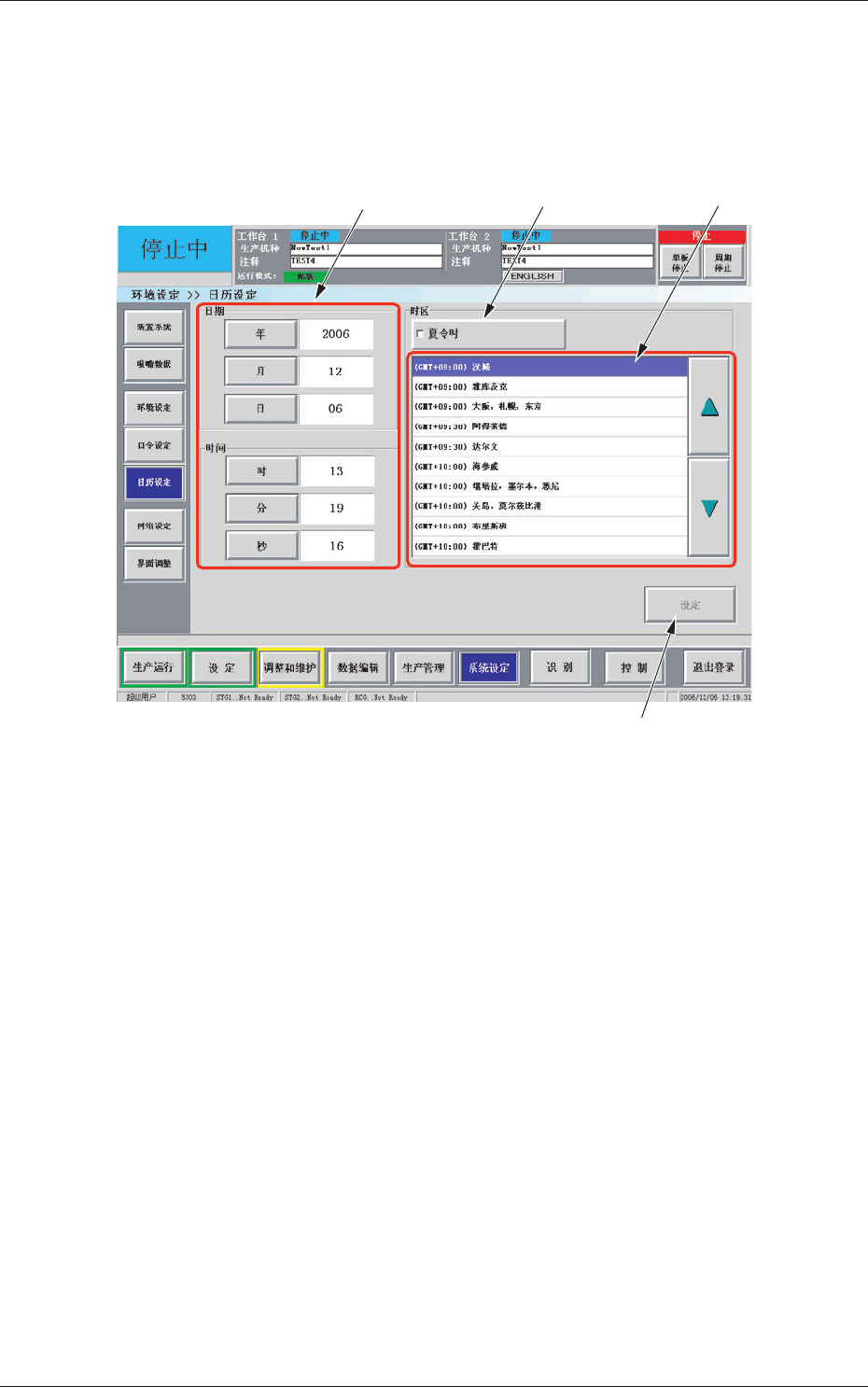 6 - 90 0612 - 002 6. 日历设定 6. 日历设定 按“系统设定”菜单栏的 [ 日历设定 ] 按钮,显示“日历设定”界面。 可以设定装置的系统时间 ( 年、月、日、时、分、秒 ) 及时区。 [1] [2] [4] [3] Fig.3F80 “日历设定”界面 [1] [ 编辑 ] 按钮 每个年、月、日、时、分、秒、都设置有显示输入界面的按钮。 [2] 夏令时指定 夏令时的情况进行选定 ( 按单选框、将 设为 )。 …