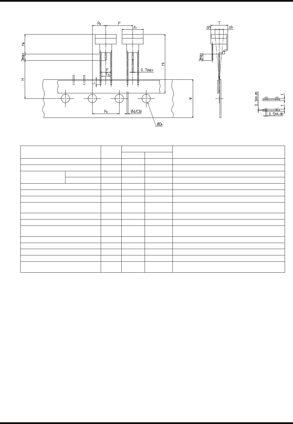 RL132 参考手册 2.5 适用元件 DA9RCC-12-160-B0 2.5-15 12. 微调电容器 尺寸 (mm) 内容 记号 数值 容许范围 备注 元件宽度 A 1 10 最大 元件厚度 T 6.5 最大 圆形引脚 Ø d 0.5 ±0.05 引脚线直径 方形引脚 □ d *0.5 ±0.05 *(0.5±0.05) x (0.3±0.05) 元件间距 P 12.7 ±1.0 孔间距 P 0 12.7 ±0.3 累积间距误差 …
