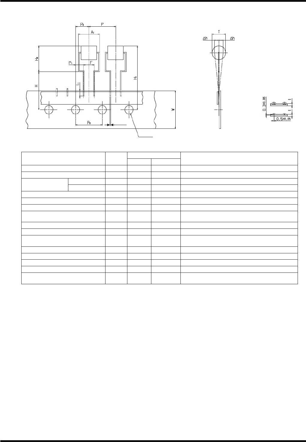 RL132 参考手册 2.5 适用元件 DA9RCC-12-160-B0 2.5-19 16. 电阻器 尺寸 (mm) 内容 记号 数值 容许范围 备注 元件宽度 A 1 13 最大 元件厚度 T 6.5 圆形引脚 Ø d 0.5 ±0.05 引脚线直径 方形引脚 □ d *0.5 ±0.05 *(0.5±0.05) x (0.3±0.05) 元件间距 P 12.7 ±1.0 孔间距 P 0 12.7 ±0.3 累积间距误差 = 1.0…