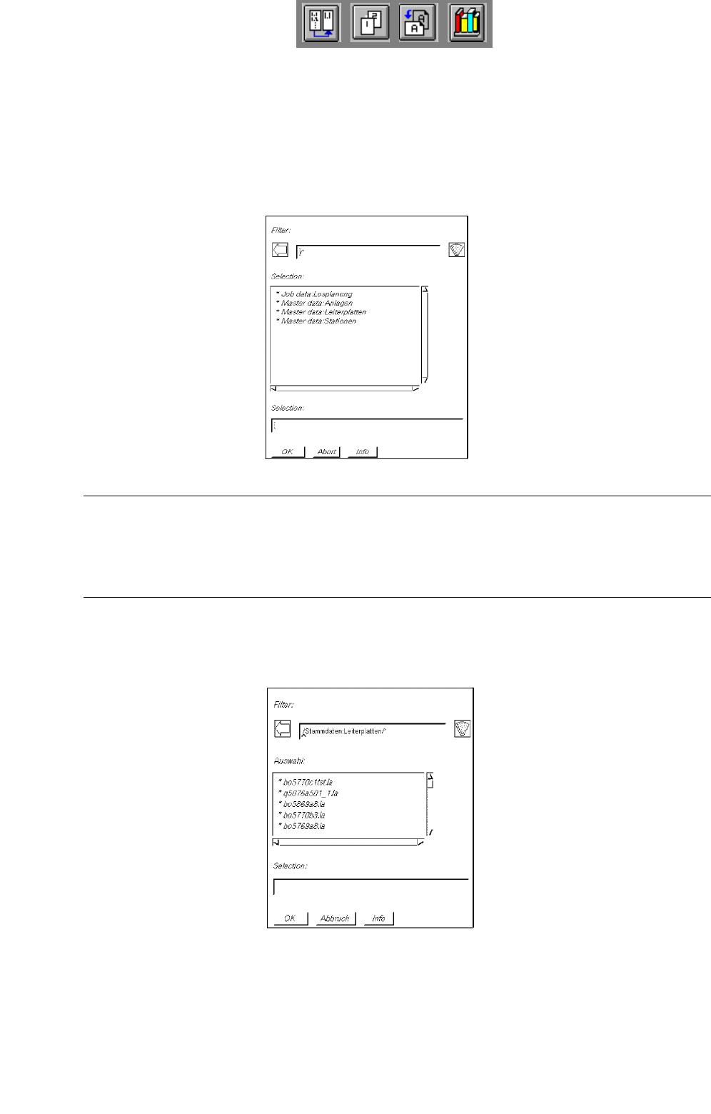 4 Datenverwaltung Betriebsanleitung Linienrechner UNIX 4.5 Dateianzeige Softwareversion 502.xx Ausgabe 10/2000 144 I t I I Starten der Date ianzeige ü ber den Desktop am Beispiel einer Fehlerdate i im Verz eichni s "…