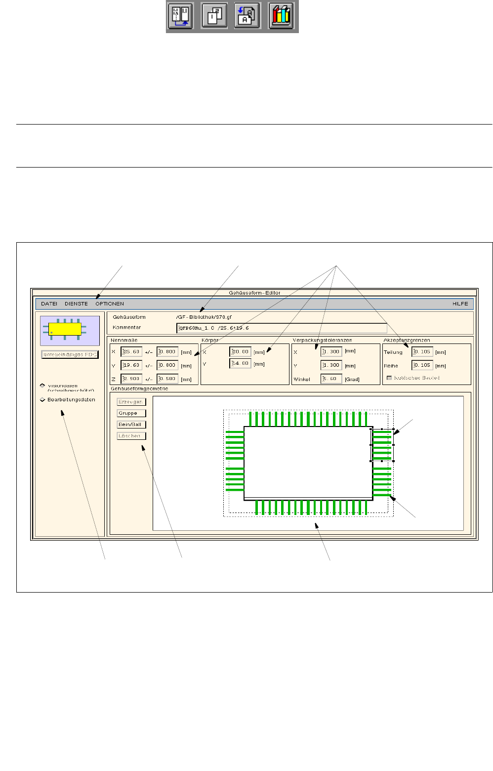 Im GF-Editor kann eine bereits definierte Gehäuseform für einen BE-Typ editiert oder eine neue Gehäuseform