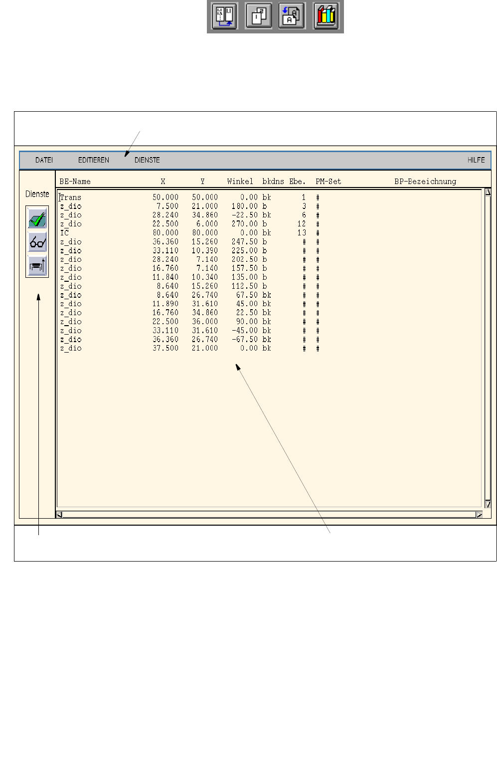Die Menüzeile enthält die Menüs "DATEI", EDITIEREN", "DIENSTE" und "HILFE".