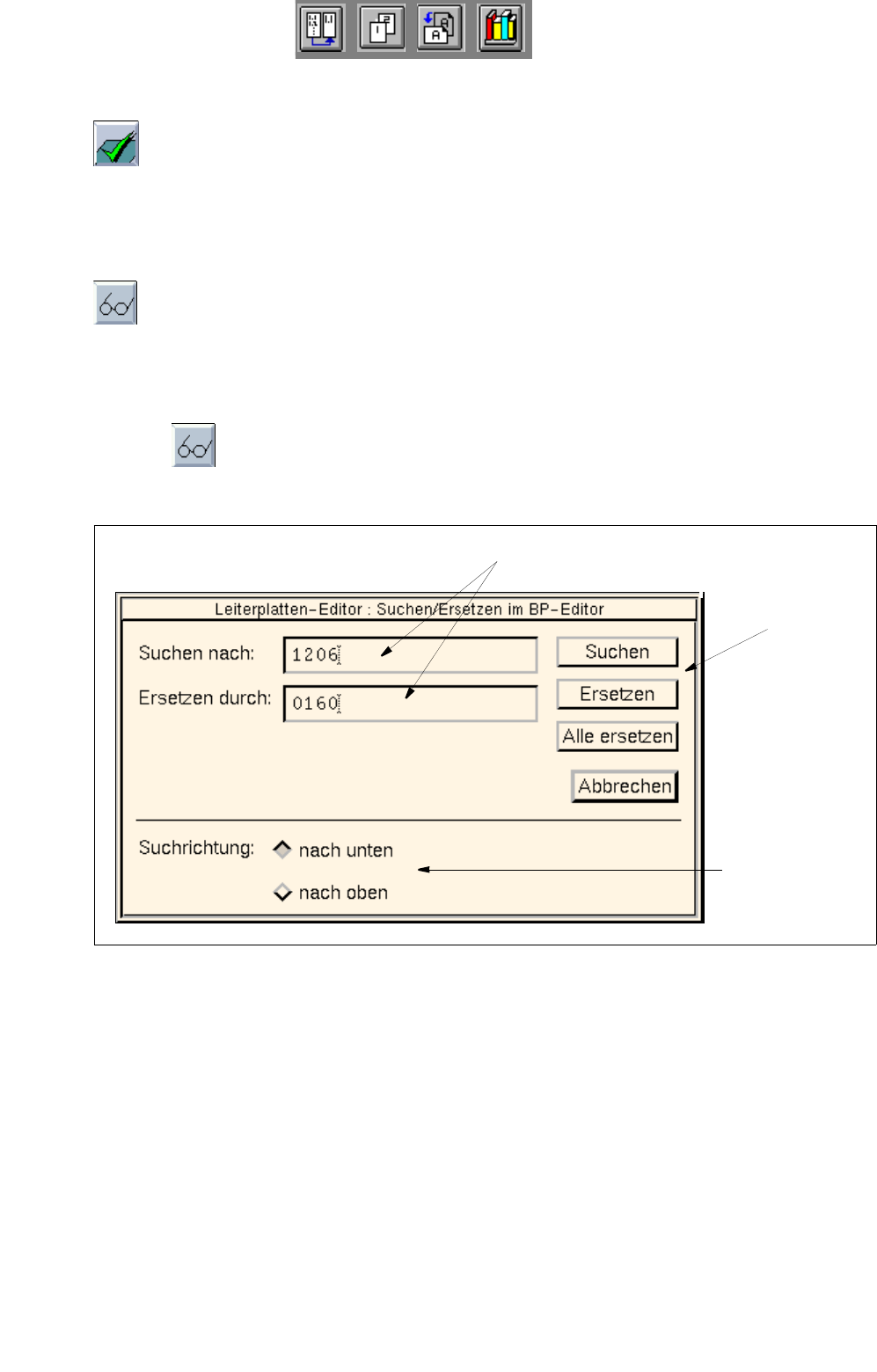 8 Produkt / Leiterplatte Betriebsanleitung Linienrechner UNIX 8.1 Leiterplatten-Editor Softwareversion 502.xx Ausgabe 10/2000 276 I t I I Vorgehens weise f ü r Suchen und Ersetzen von Zeichenfolgen ● Button mi t der gew …