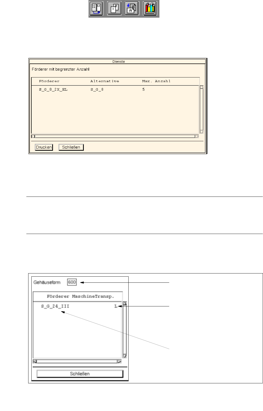 9 Produktionsmi ttel / F ö rderer Betriebsanleitung Linienrechner UNIX 9.1 F ö rdere r-Editor Softwareversion 502.xx Ausgabe 10/2000 286 I t I I 9.1.3 .2 Auswahl bereich " Geh ä useform/Bauelement" Dieser Be re…