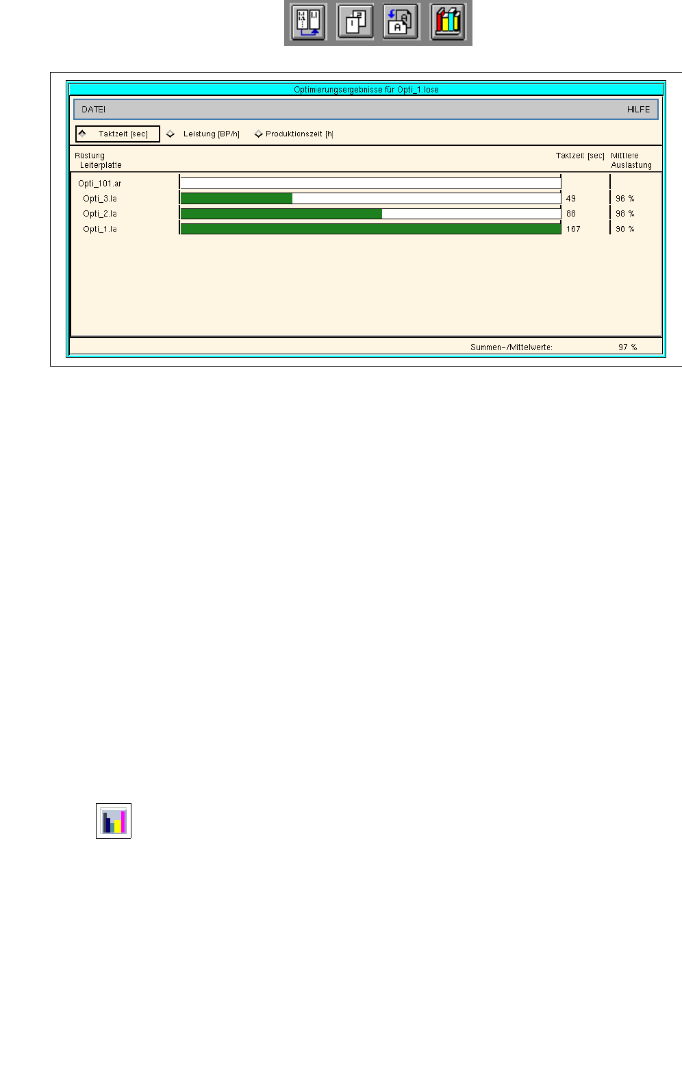 Mit dieser Ikone können die Ergebnisse der Rüstoptimierung für die gesamte Losdatei sowie die einzelnen