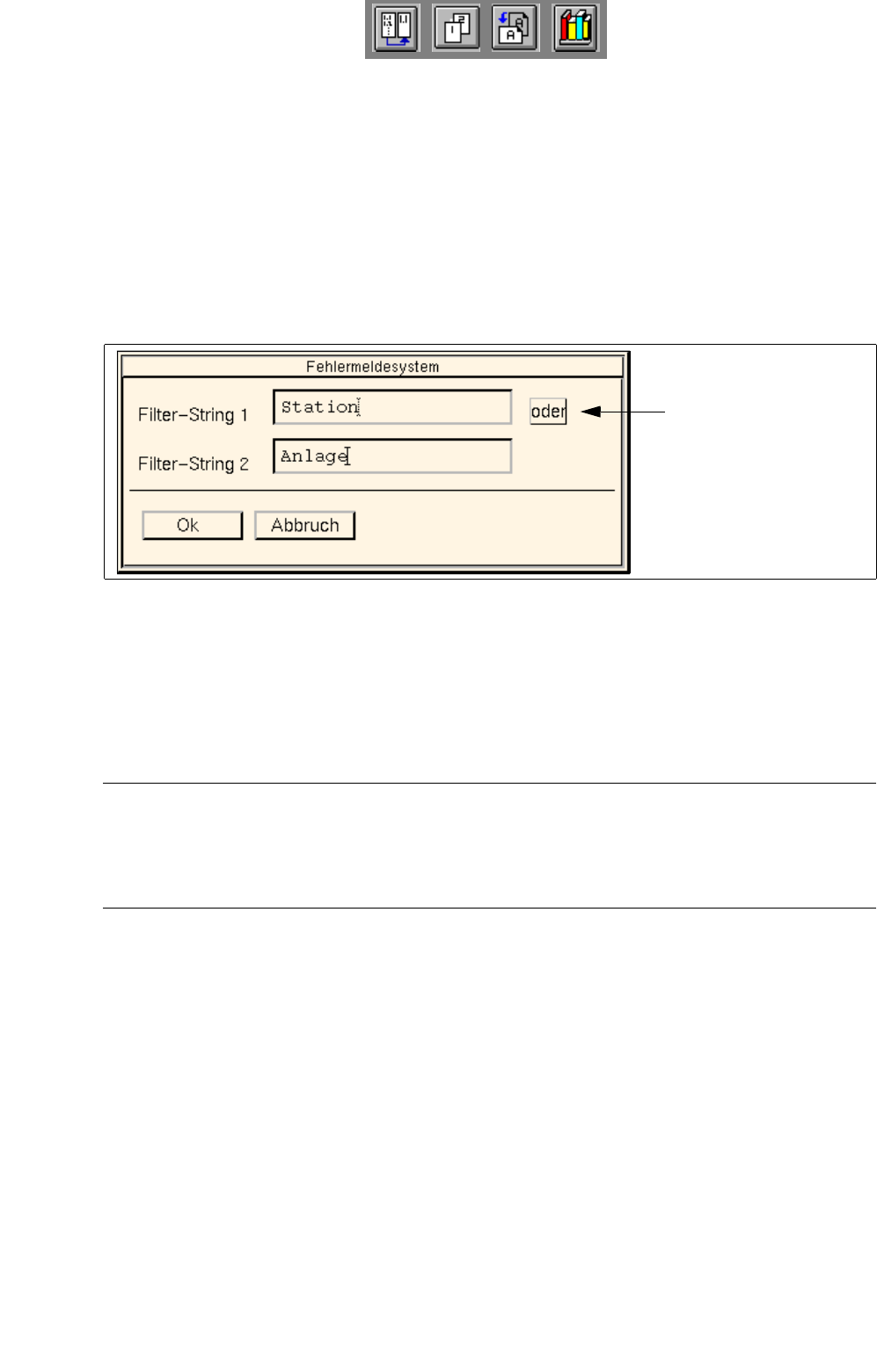 ● Im Editierfeld "Filter-String 1" die erste Zeichenkette eingeben, nach der die angezeigten Meldun-