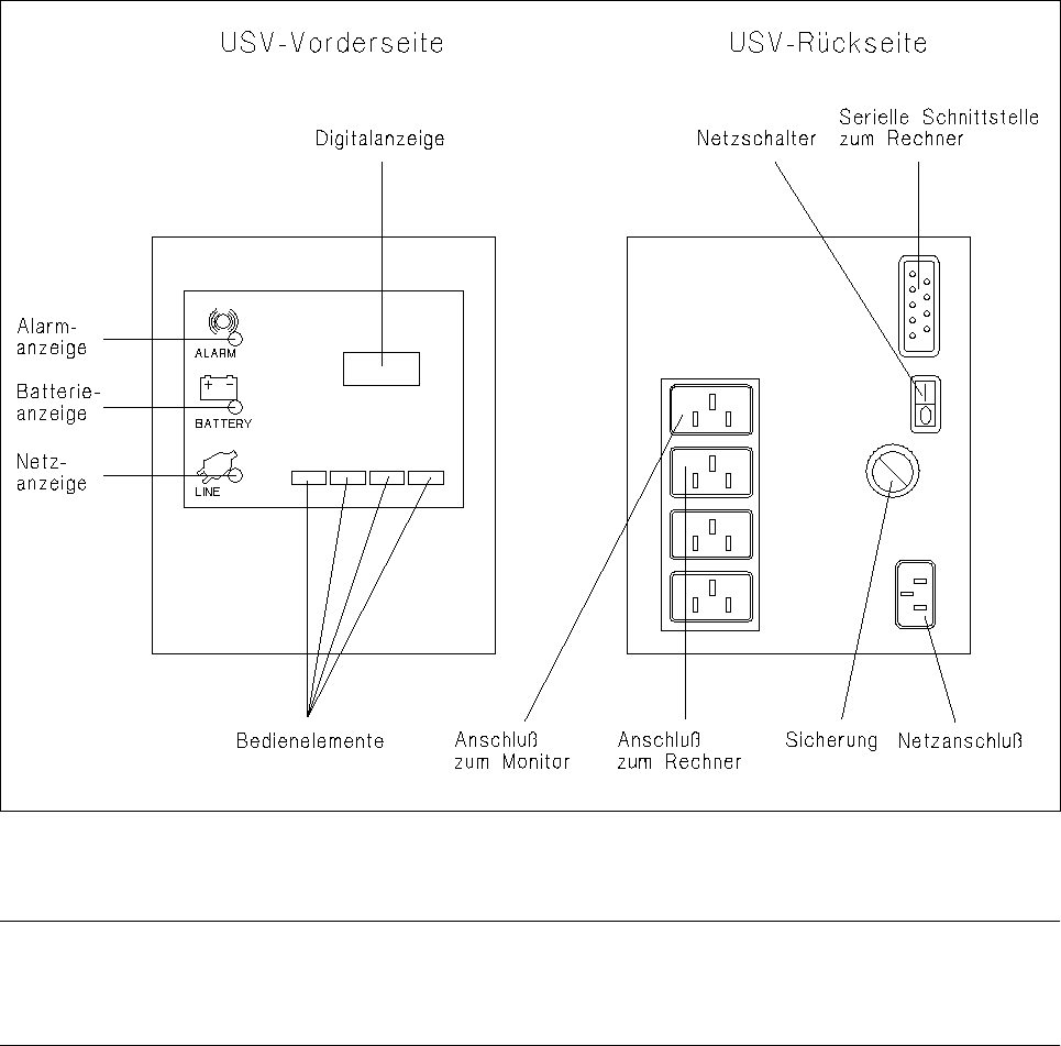 Abb. 1.1.1 USV - Anschlüsse, Anzeigeelemente, Bedienelemente