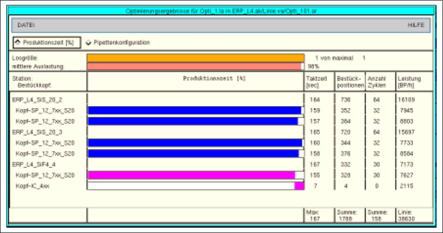 Für jede Station, jeden Bestückkopf und für die gesamte Linie sind die Ergebnisse der Optimierung in