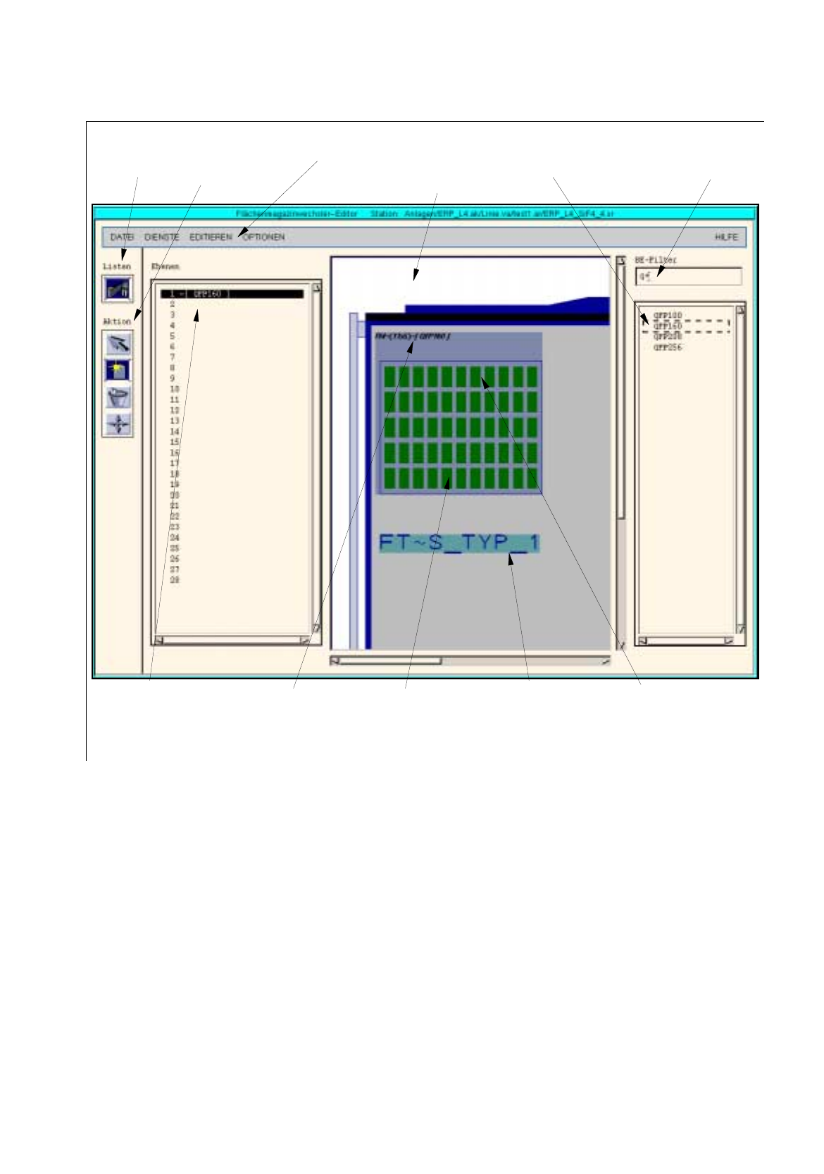 Im Anzeigebereich ist ein Förderbereich einer Station mit den einzelnen Spuren symbolisch dargestellt (siehe
