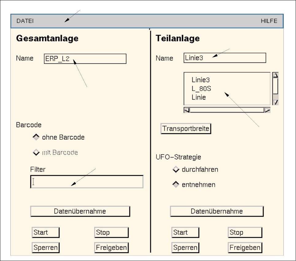 editiert und die UFO-Strategie eingestellt werden. Außerdem kann der Bediener die Teilanlage starten/stoppen