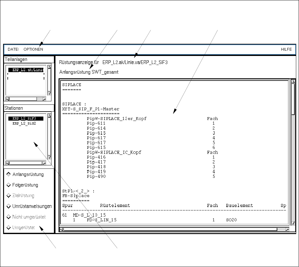 Im Hauptfenster kann sich der Bediener z.B. die Daten der Anfangsrüstung und die Umrüstanweisung auf