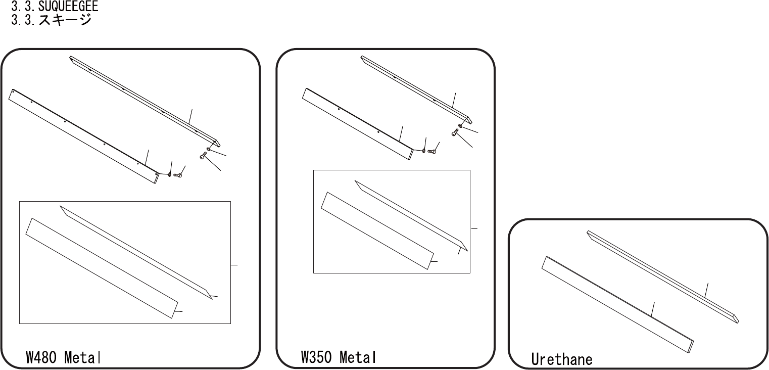 3.3.SQUEEGEE 3.3.スキージ No. Drg.No. & Code No. QTY Description Rating Materials Remarks 番号 図番 & コード番号 個数 品名 規格 材質 備考 1 PM97351 2 PLATE, BACKUP プレート バックアップ AL 480mmX31mm METAL 2 H5276A 12 BOLT, HEX SOCKET ボルト 六角穴 M…