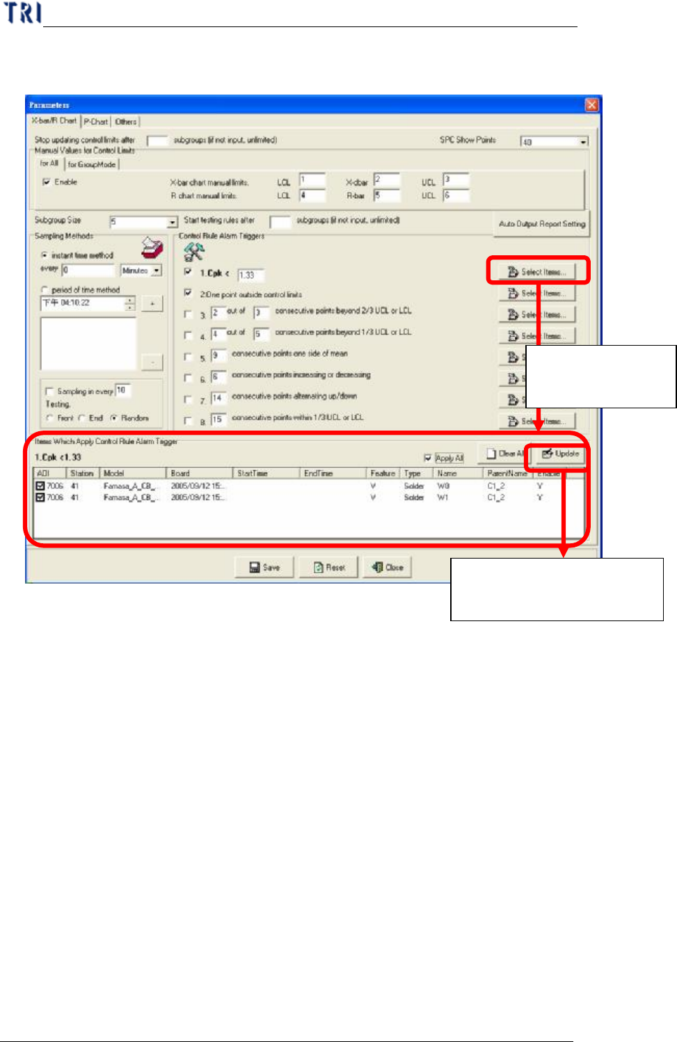 單元 三 、 S PC 使 用手冊 AO I R e p a i r S t a t i on 使 用 手冊 141 制 上限 值 , 或 者 3 分之 1 的 管 制 下 限 值 之 內 時, 就 代 表 發 生 異 常 。 u 每 個 A l a rm 可 以設定 它 所 適 用的 「 非 即時 顯 示 性 監 控 項目 」 , 其 方式 為按 下 要 設定的 A l a rm 右 方的 「 S e l ec t I t e ms …