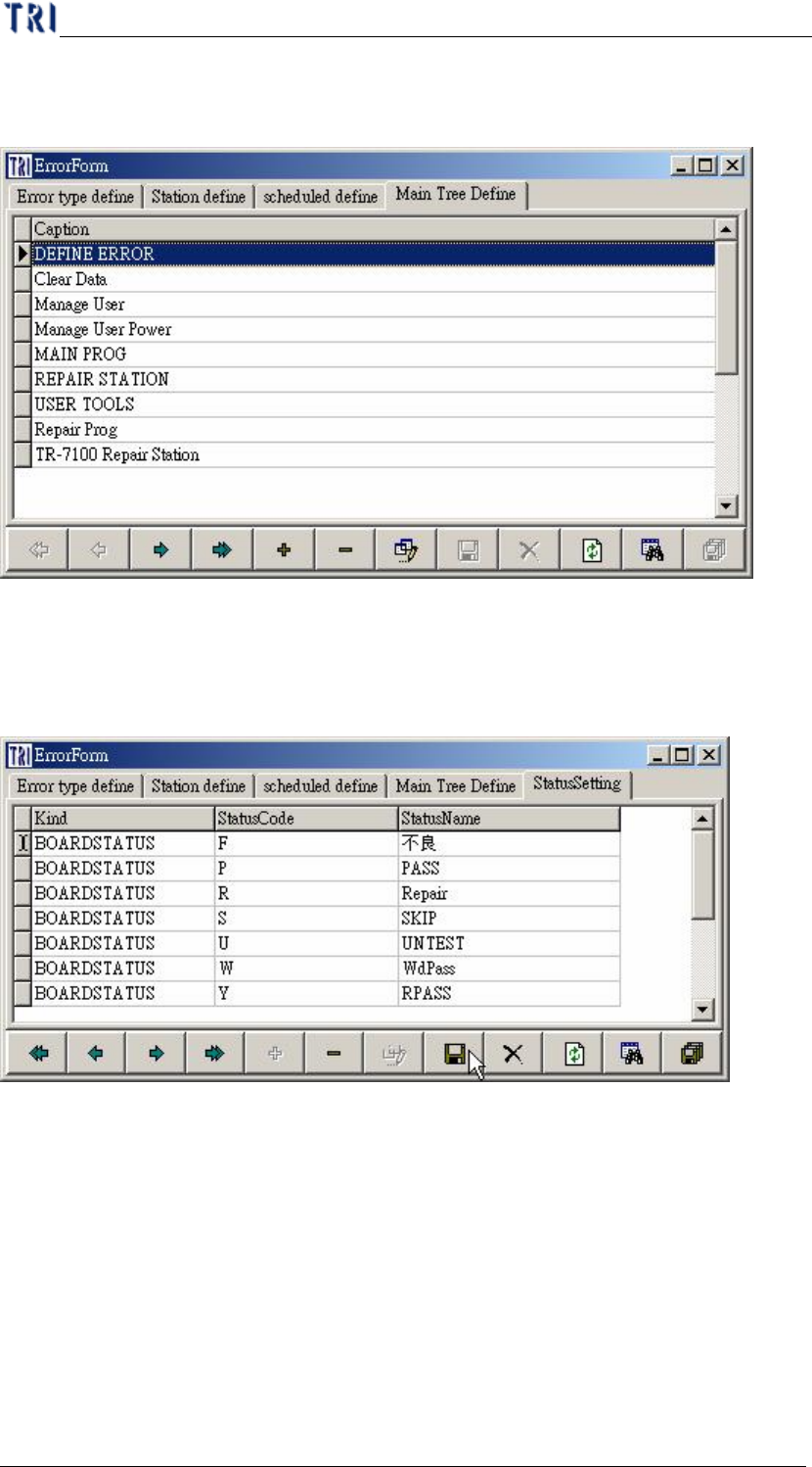 單 元 二、 R e p a i r S t a t i o n 使 用說明 AO I R e p a i r S t a t i on 使 用 手冊 57 7 .4 M a i n T r ee D e f i n e Ø 可 在 此 定 義 主程式 樹 狀 圖 中 所 顯 示的 文 字內容 7 .5 S t a t u s S e t t i n g Ø 可 在 此 處 修改 板 子錯誤 類 型 的 顯 示 名 稱, 只 有 [ S…