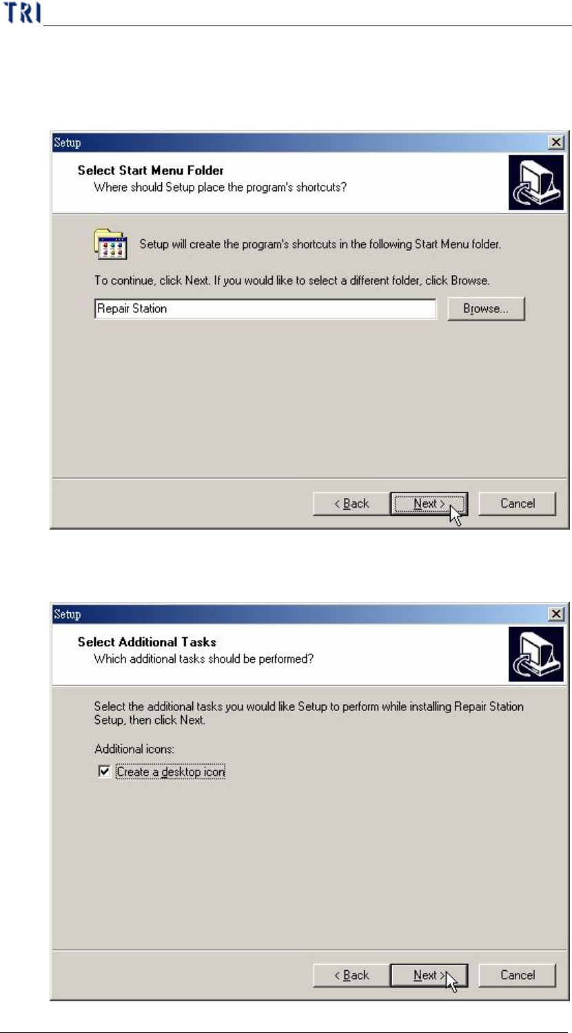 單 元 一、 安 裝步驟 AO I R e p a i r S t a t i on 使 用 手冊 3 S t e p 3. 選擇 安裝的資料 夾, 建議依 預 設值安裝 ,不 要 修改 。 接 著 按 [ N e x t] 。 S t e p 4. 依 預 設值 勾選 [ C r ea t e a d e s k t o p i c o n] ,接 著 按 [ N e x t] 。