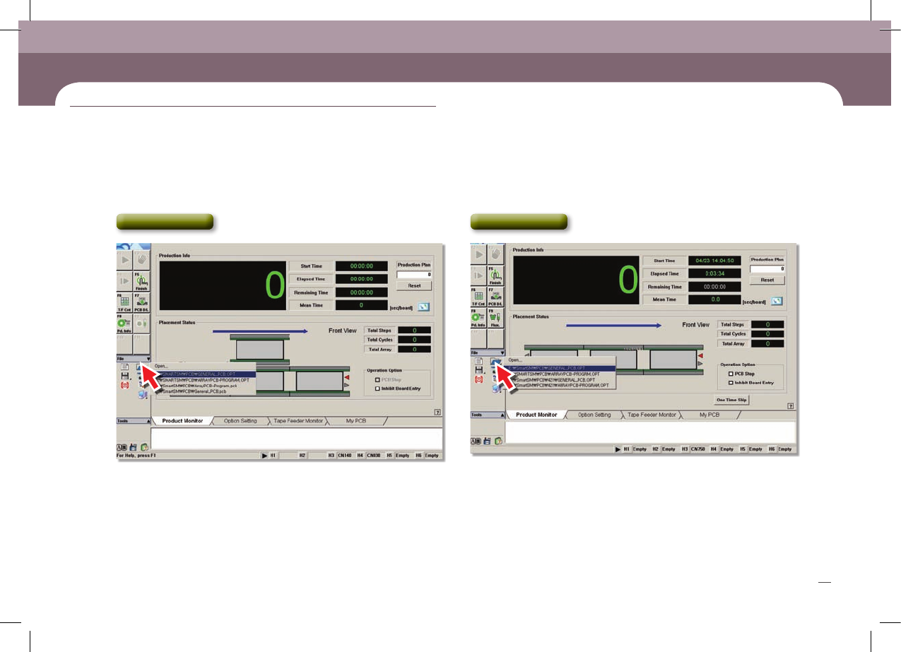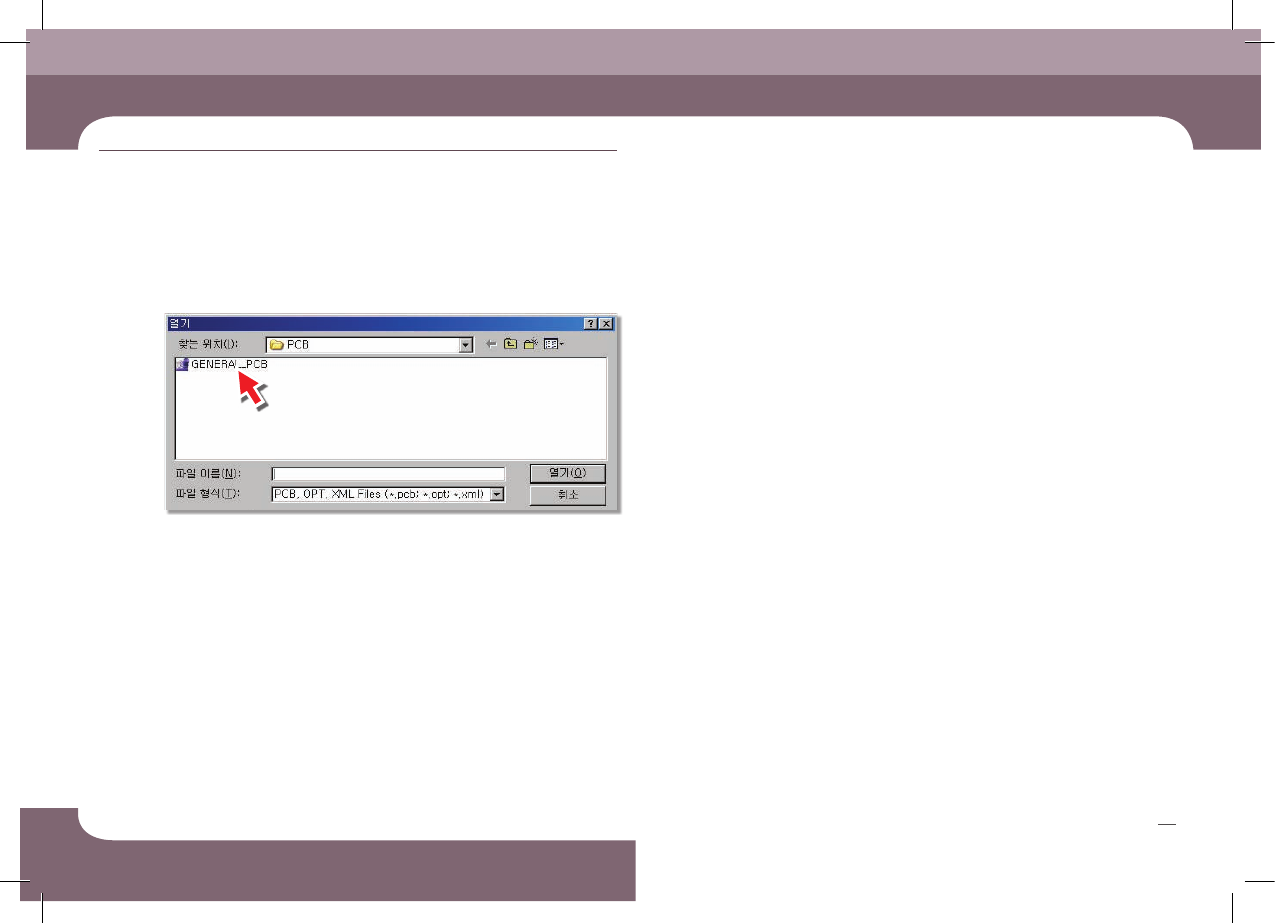 Operation Handbook 26 Chap ter 3 Adva nced Fl exible Compone nt P lacer 생 산 하 기 본 Pa rt 에서는 생 산을 수 행하 는 작 업 절차 에 대해 알아 봅니 다. - 열기 대화 상자를 엽니다. 1 . P CB 파일 로 딩 3 ‘Open ’ 클 릭 Mo de l: 4 11 Mo de l: 4 21 , 41 1F