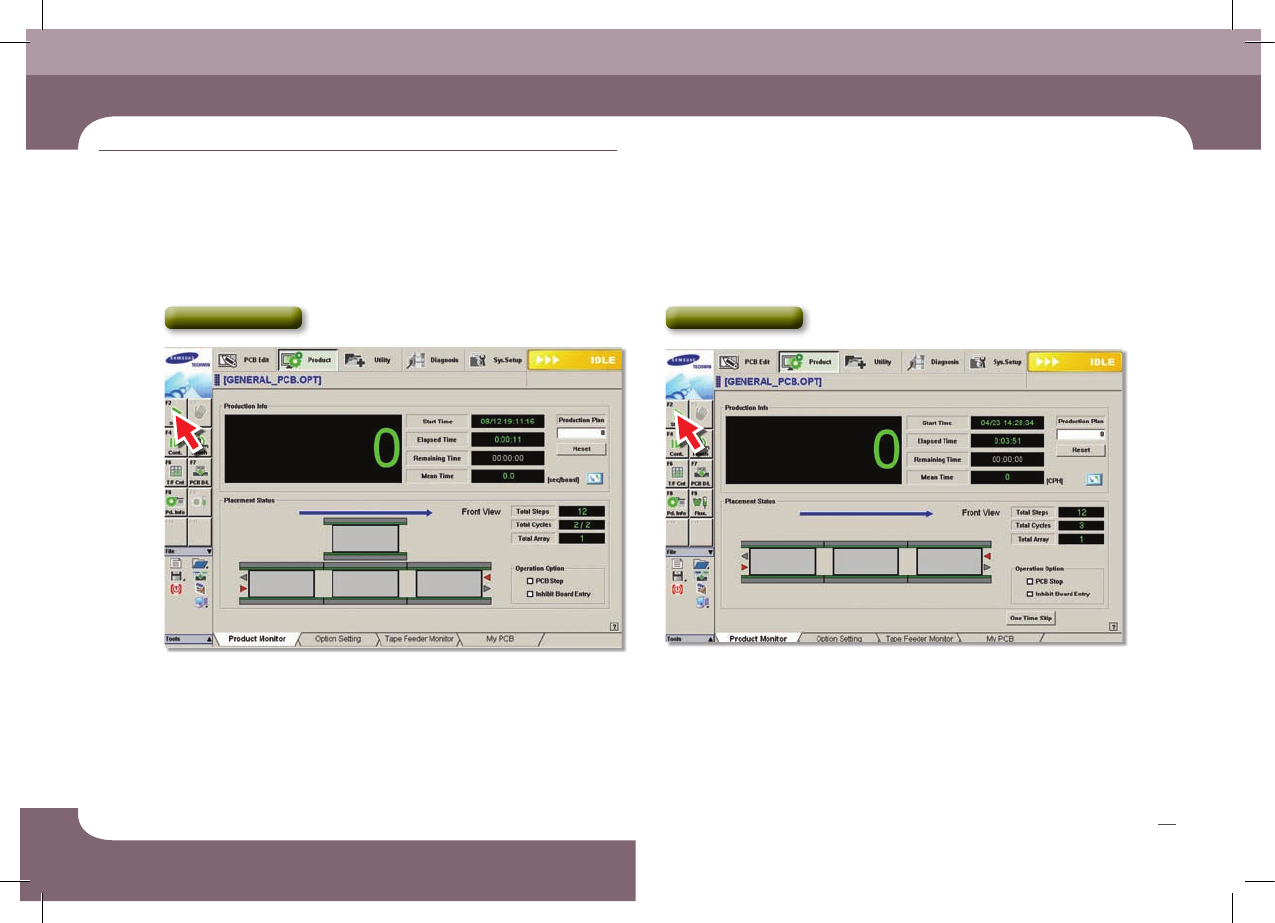 Operation Handbook 38 Chap ter 3 Adva nced Fl exible Compone nt P lacer 생 산 하 기 본 Pa rt 에서는 생 산을 수 행하 는 작 업 절차 에 대해 알아 봅니 다. - 생산 을 시작 합니다 . 반드 시 장비 주변 작업 자의 유 무를 확인 한 후 생산을 시 작하 십시 오. 경 고 2 . 작 업시 작( 자동생 산 ) 1. 전 면 조작 패…