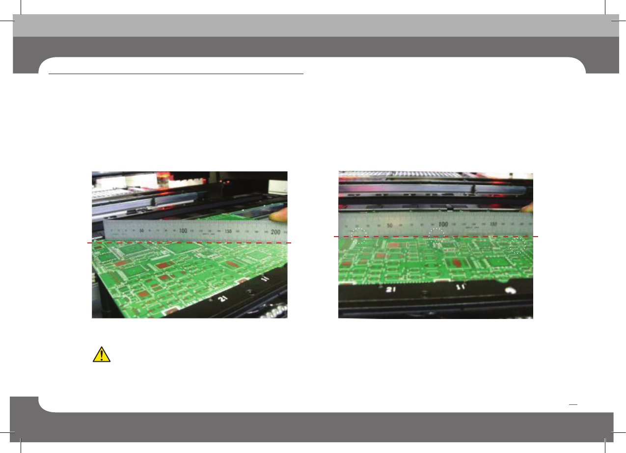- 줄자를 이용하여 대각선 방향의 PCB의 평탄도를 확인합니다. - 줄자를 이용하여 수평방향 3지점에 대한 PCB의 평탄도를 확인합니다.