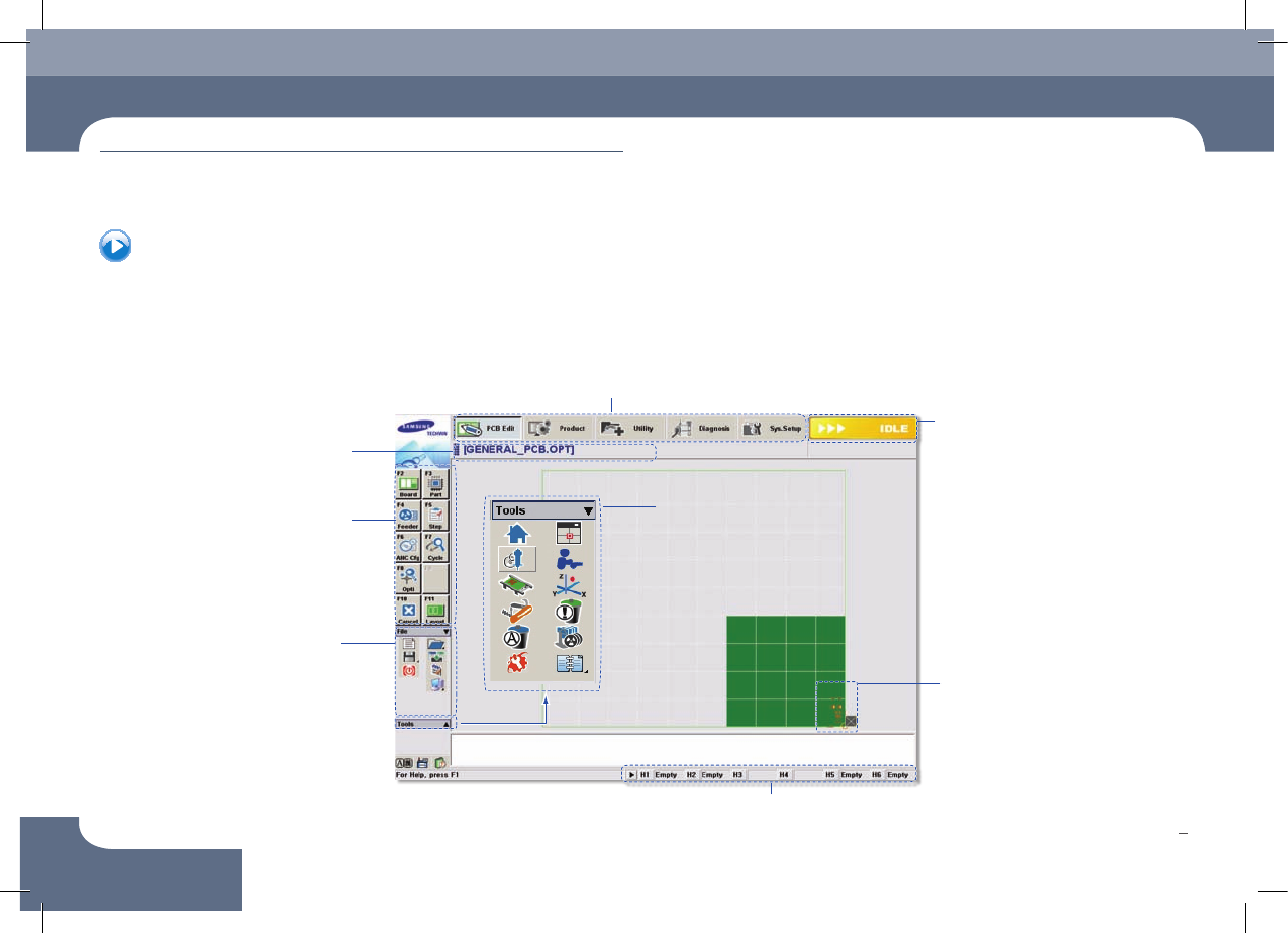 Chapte r 1 장 비 Ov er v i ew Operation Handbook 9 Chap ter 1 Adva nced Fl exible Compon ent Placer 장비 Ov e rv i e w 본 Pa rt 에서는 장 비, 조 작 패널 및 MM I( Ma n-M ach in e Int er fa ce )에 대하 여 살펴 봅니다 . 헤 드의 노 즐 정 보 표시 Sh or tc ut…