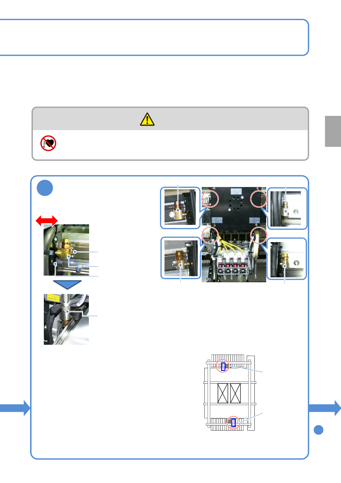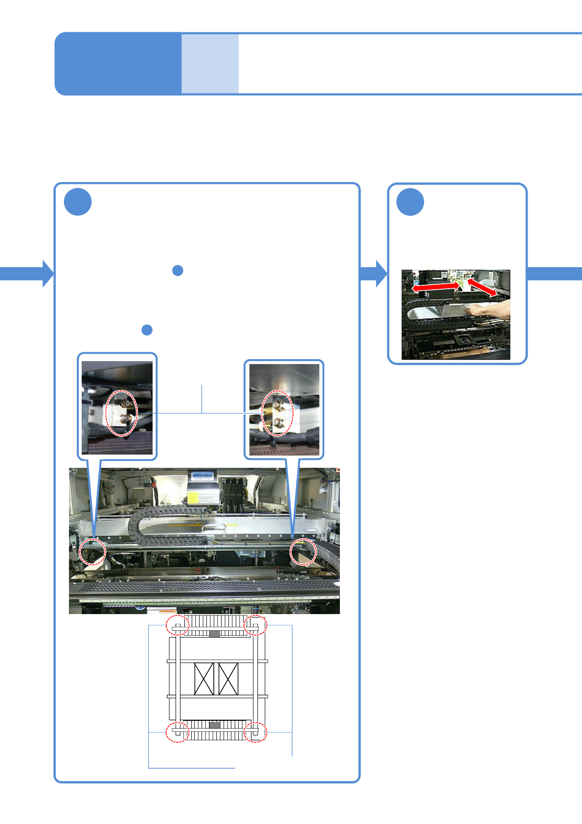 NPM-W 2 EJM7DC-MB-06M-05 6-2 -2 顺序 警告 使用心脏起搏器的人员请勿靠近直线马达部 (由于磁力造成错误动作,可能受伤) 每 5 6 0 小 时 保 养 定 期 检 查 8 对 X 轴线性导轨添加润滑脂 ●按照以下顺序,从上下 4 处润滑脂注入口进 行润滑脂添加。 ①压出 1/4 。 ( 约 0.25 cm 3 ) ②使 X 轴移动约 100 mm 。 ③压出 1/4 。 ( 约 0.25 cm 3 ) ●…
