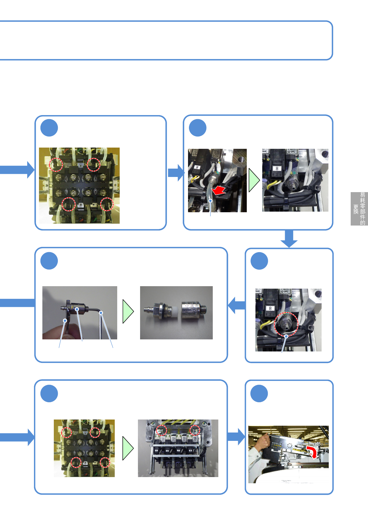 NPM-W 2 EJM7DC-MB-12M-07 12-9 -2 12 13 安装配线固定用托架的螺丝后,安装托架 ●螺丝 ( 前侧 2 个、后侧 2 个 ) 使用工具 : 六角扳手 (2.5mm) 安装贴装头后,进 行校准 ( → P.11-1) ●螺丝 ( 4 个 ) 3 4 5 卸下配线固定用托架的螺丝 使用工具 : 六角扳手 ( 2.5 mm ) ●螺丝 ( 4 个 ) 卸下软管 ● 8 处 软管 卸下过滤器 ● 8 处 使用工…