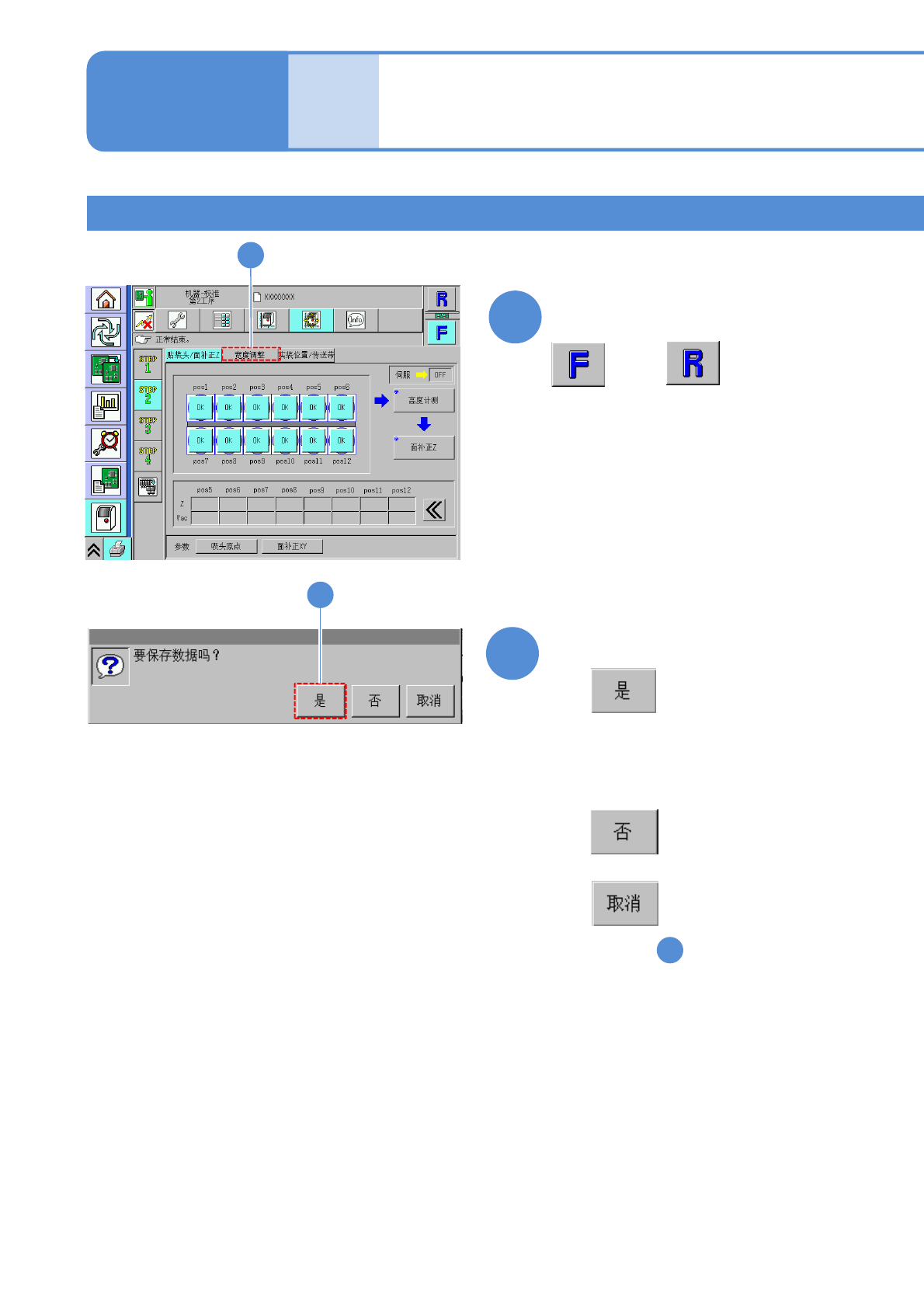 NPM-W 2 EJM7DC-MB-13M-02 22 13-4 -5 22 确认是否已正常结束 23 确认提示 ( 面补正 Z 数据被保存 ) ■不保存时 ■取消时 ( 仍然是 的画面 ) 22 23 贴装头 3 贴装头 / 面补正 Z3 维修保养篇 13-4 ( 贴装头移动到退避位置 ) 或者