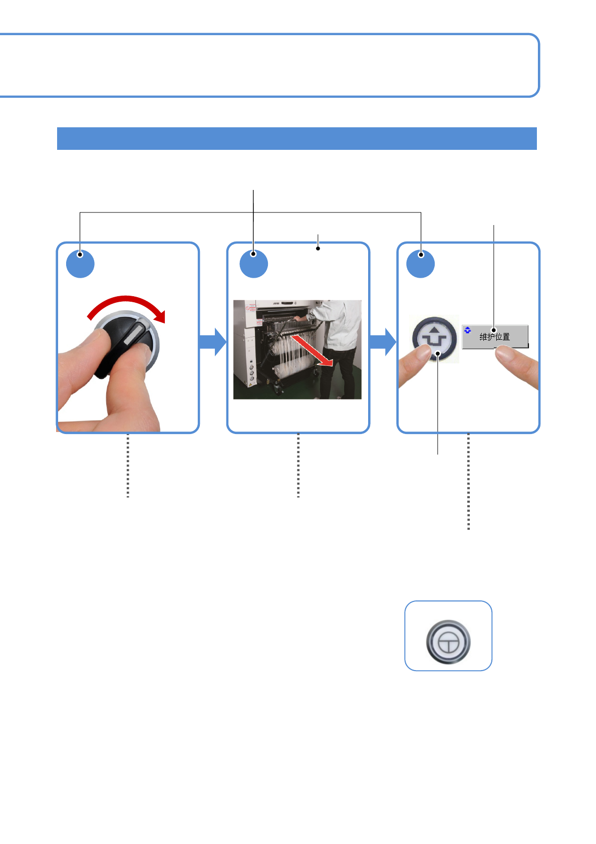 NPM-W 2 EJM7DC-BP-04N-03 1 2 3 ACTIVATION 卸除交换台车 ( → P .3-2) 表示按照箭头方向旋转。 S-9 顺序/操作 一目了然 操作顺序 操作按钮 操作内容 表示按照箭头方向往外拉。 SERVO ON A C T I VAT I O N 开关 或 ENABLING 开关 表示在按下 A C T I VAT I O N 开关或 ENABLING 开关 状态下, 同时按另外一个开关或按钮。 (…