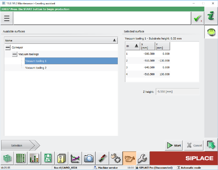 The leveling assistant helps the user to adjust the z-height of the vacuum tooling. Additionally,