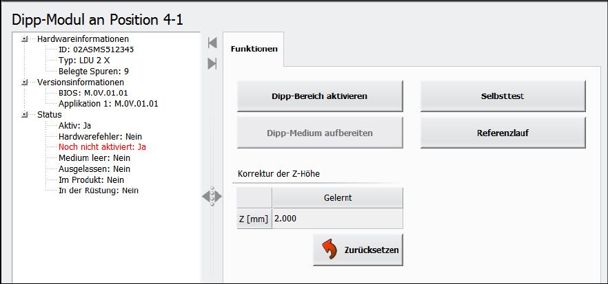 Fehlermeldungen, die das Linear Dipping Unit 2 X betreffen, werden auf der GUI der