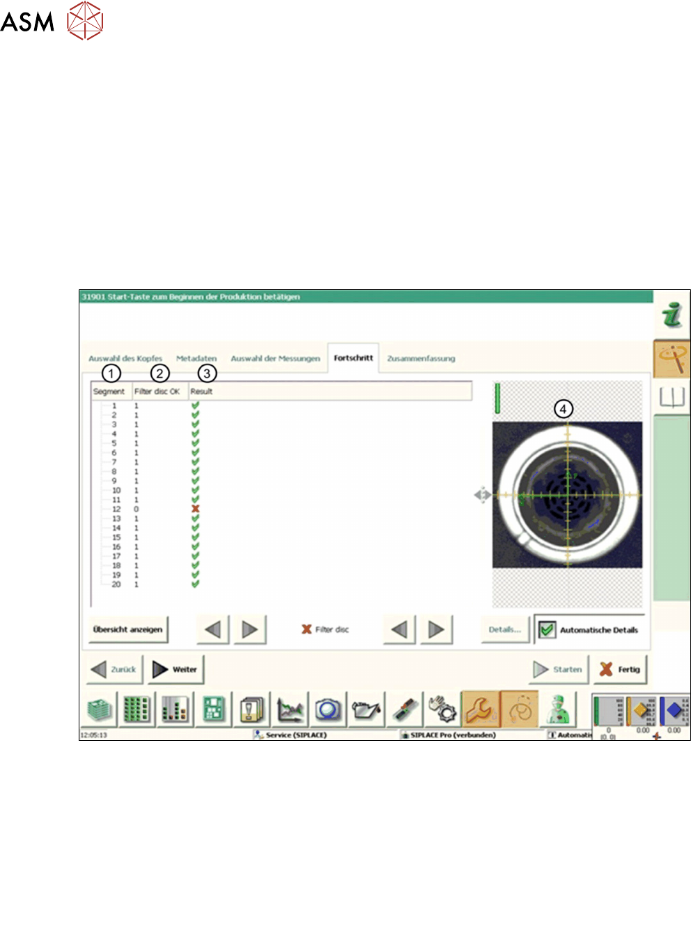 6 Beschreibung der Testergebnisse 6.10 Filterscheibe Software Manual SIPLACE Head Verification 03/2018 57 6.10.3 Interpretation der erzielten Ergebnisse "Filter disk OK"-Fehler bei allen Segmenten Ursache Lösun…