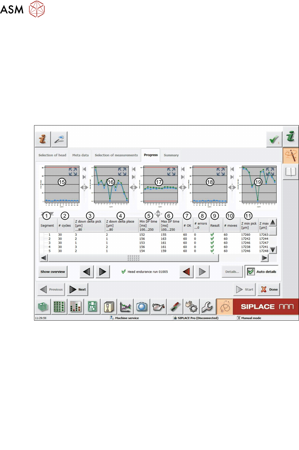 6 Beschreibung der Testergebnisse 6.14 Kopfdauerlauf 01005 Software Manual SIPLACE Head Verification 03/2018 65 9 Result -Anzeige mit Angabe, ob die Werte innerhalb (grüner Haken) oder außerhalb (rotes Kreuz) der Grenzwe…