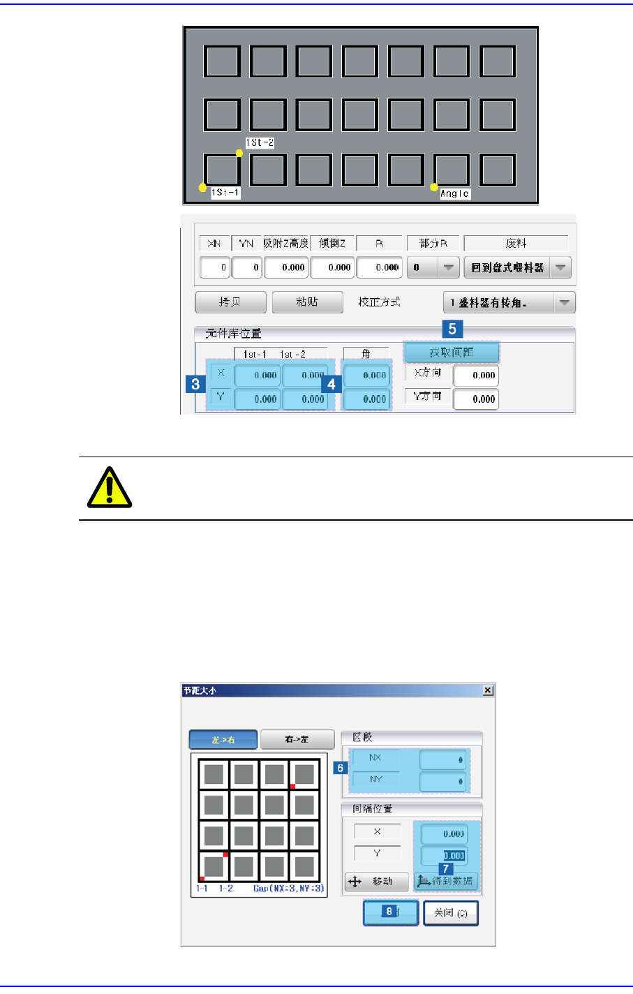 4-30 Cutting-edge Modular Mounter HM520 Administrator's Gui de (2) 首先请输 入所有拼块的数量。 XN: X 方向的拼块总数 量 ( 列 ) YN: Y 方向 的拼块总数量 ( 行 ) 注 意 请在确定拼块坐标前一定 " 要先 " 输入 X N, YN 的值。 (3) 为了确定 第一个拼块对角线角的坐标值 (1St1,1S t2) , 移动各…