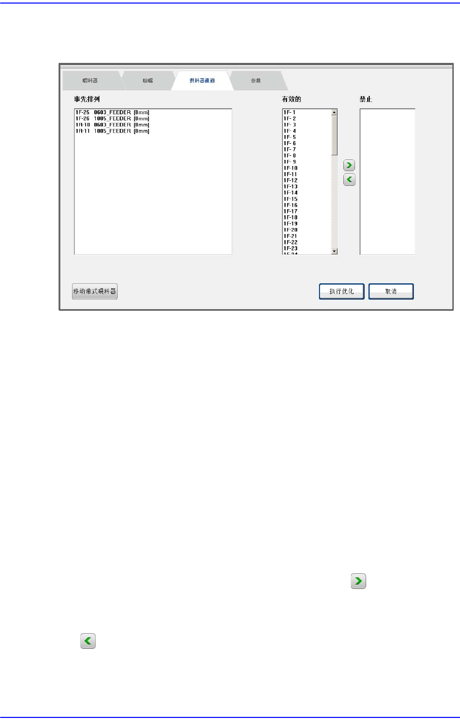 此对话框设定用于优化喂料器配置的 喂料器通道。配置在 喂料器通道的装置包括