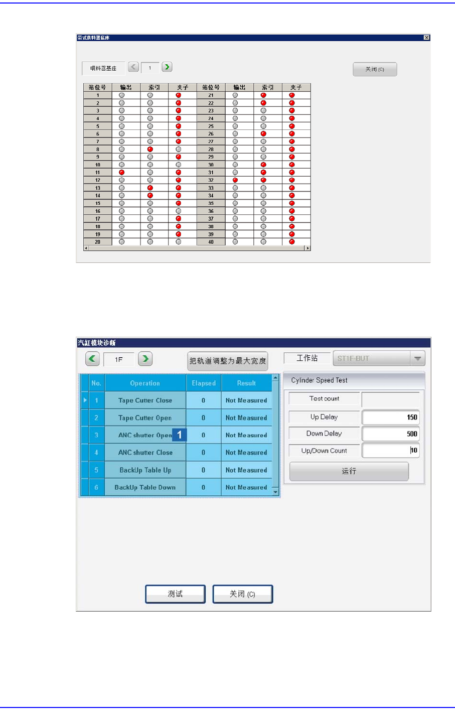 11-3 Diagnosis( 诊断 ) 图 11.3 “Tape Feeder base“ 对话框 < 汽 缸检查 > 按钮 检查 Cylinder Module. 点击此按钮则 显示如下对话框。 图 11.4 “ 汽缸模块诊断 “ 对话框 1: Operation T est