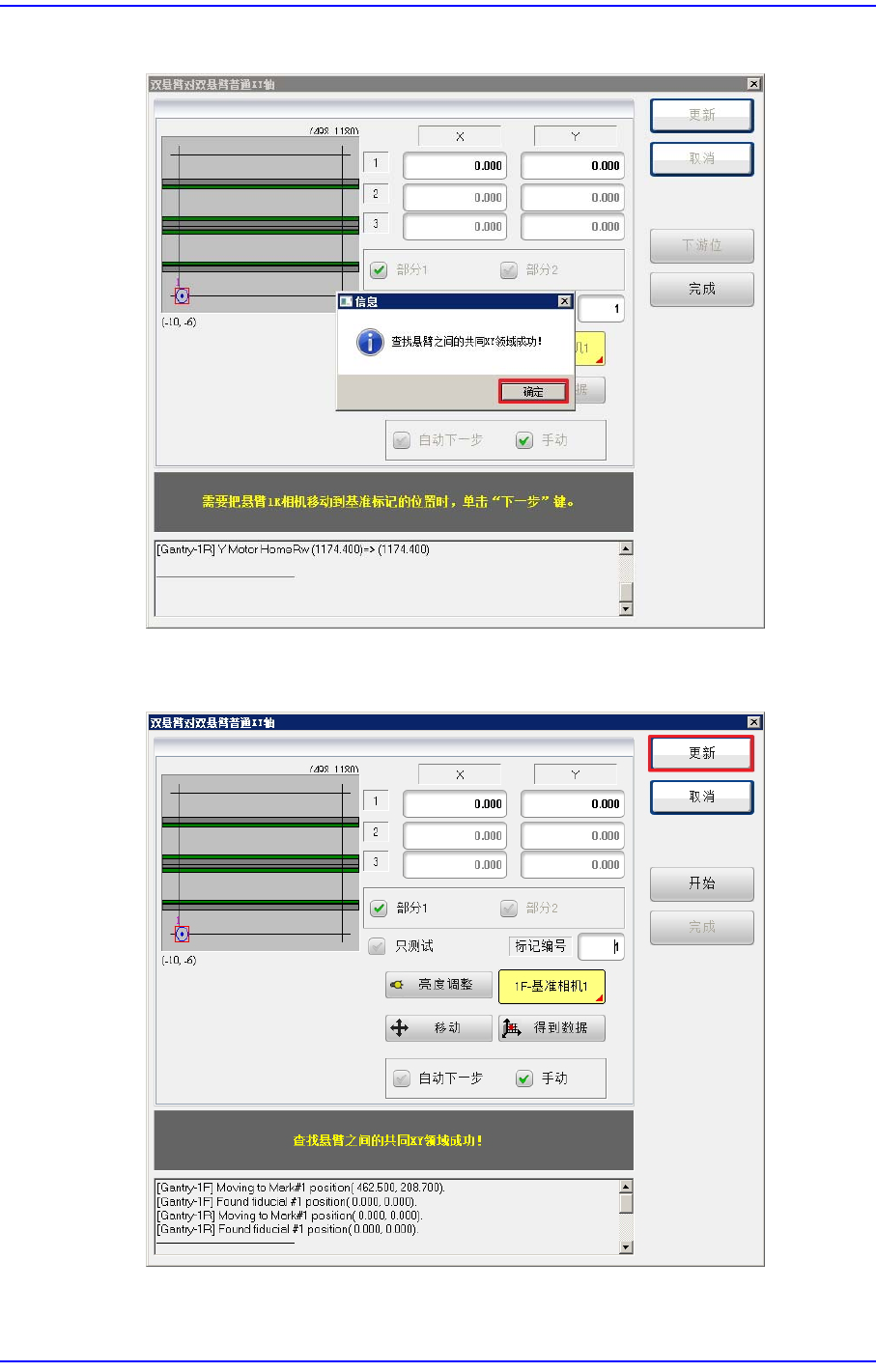 10. 校准完毕后,按下< 更新>按钮。保存共同坐标信息并实行了返回原点动作后,