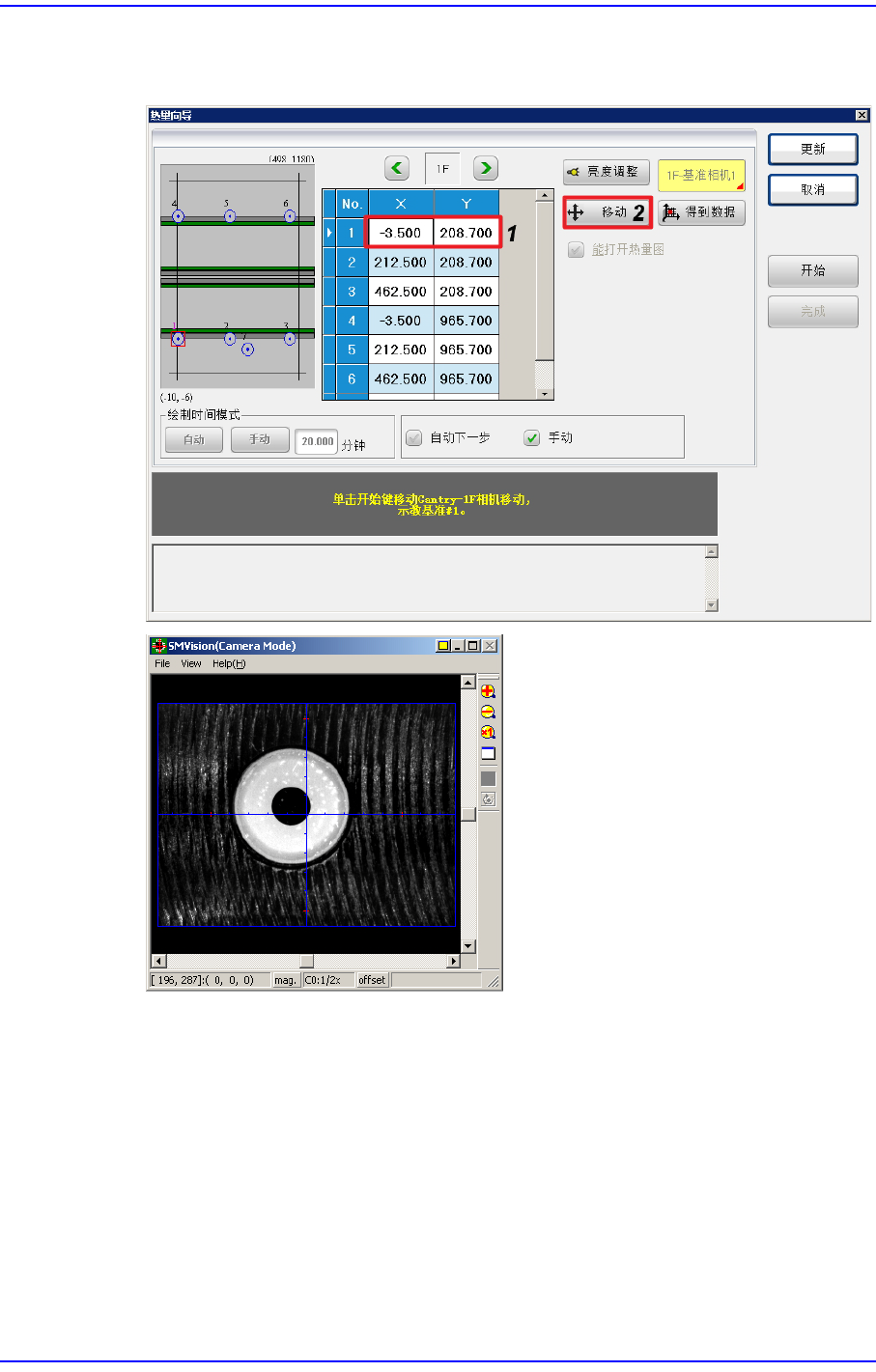 12-35 Machine Calibration 2. 在格子领域选 择 1 号行后, 按下 < 移动 > 键。 利用示教框调整基准相机 的位置, 使得 Vi s i o n 窗口上显示的十字线的中心 与基准标志的中心一致。
