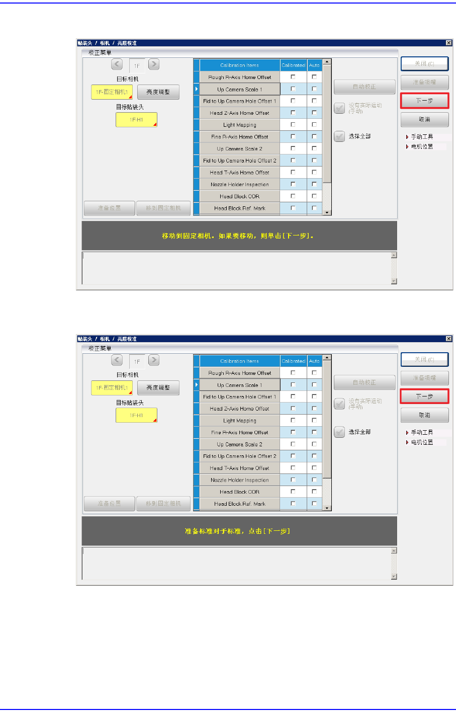 3. 按下<下一步>按钮时,贴装头模组朝固定相机移动并自动进行校准